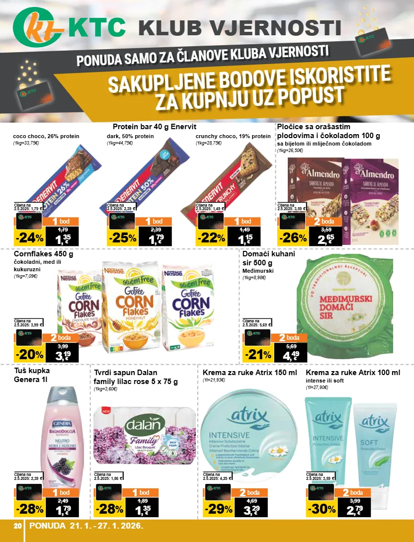 ponuda samo za članove kluba vjernosti sakupljene bodove iskoristite za kupnju uz popust klub vjernosti 20 ponuda 17.9. - 23.9.2025. cijena na 2.5.2025: 1,79 € cijena na 2.5.2025: 2,39 € cijena na 2.5.2025: 1,49 € cijena na 2.5.2025: 3,99 € cijena na 2.5.2025: 5,69 € 1,79 1 , 35 - 24 % 1 bod € 1,49 1 , 15 - 22 % 1 bod € 2,39 1 , 79 - 25 % 1 bod € protein bar 40 g enervit dark, 50% protein (1kg=44,75€) crunchy choco, 19% protein (1kg=28,75€) coco choco, 26% protein (1kg=33,75€) cijena na 2.5.2025: 3,59 € 3,59 2 , 65 - 26 % 2 boda € pločice sa orašastim plodovima i čokoladom 100 g sa bijelom ili mliječnom čokoladom (1kg=26,50€) 3,99 3 , 19 - 20 % 2 boda € cornflakes 450 g čokoladni, med ili kukuruzni (1kg=7,09€) 5,69 4 , 49 - 21 % 2 boda € domaći kuhani sir 500 g međimurski (1kg=8,98€) cijena na 2.5.2025: 1,86 € 1,89 1 , 35 - 28 % 1 bod € cijena na 2.5.2025: 2,39 € 2,49 1 , 79 - 28 % 1 bod € tvrdi sapun dalan family lilac rose 5 x 75 g (1kg=3,60€) tuš kupka genera 1l cijena na 2.5.2025: 4,25 € 4,69 3 , 29 - 29 % 2 boda € cijena na 2.5.2025: 3,59 € 3,99 2 , 79 - 30 % 2 boda € krema za ruke atrix 150 ml (1l=21,93€) krema za ruke atrix 100 ml intense ili soft (1l=27,90€) ponuda 21. 1. - 27. 1. 2026. 20