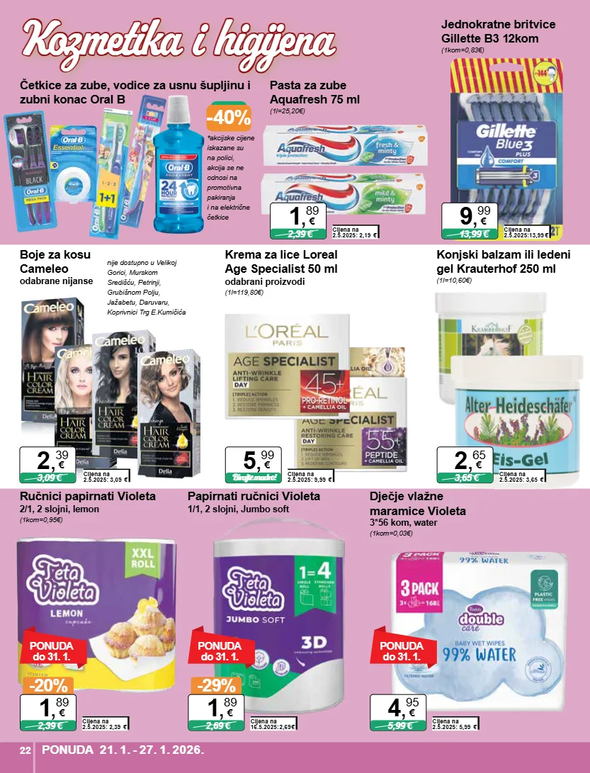 cijena na 2.5.2025:13,99 € cijena na 2.5.2025: 3,09 € cijena na 2.5.2025: 3,65 € cijena na 2.5.2025: 2,19 € cijena na 2.5.2025: 9,99 € *akcijske cijene iskazane su na polici, akcija se ne odnosi na promotivna pakiranja i na električne četkice -40% cijena na 2.5.2025: 2,39 € cijena na 16.5.2025:2,69 € cijena na 2.5.2025: 5,99 € jednokratne britvice gillette b3 12kom (1kom=0,83€) 13,99 € 9 , 99 € boje za kosu cameleo odabrane nijanse 3,09 € 2 , 39 € konjski balzam ili ledeni gel krauterhof 250 ml (1l=10,60€) 3,65 € 2 , 65 € pasta za zube aquafresh 75 ml (1l=25,20€) 2,39 € 1 , 89 € krema za lice loreal age specialist 50 ml odabrani proizvodi (1l=119,80€) birajte mudro! 5 , 99 € nije dostupno u velikoj gorici, murskom središću, petrinji, grubišnom polju, jažabetu, daruvaru, koprivnici trg e.kumičića četkice za zube, vodice za usnu šupljinu i zubni konac oral b ponuda do 31. 1. ponuda do 31. 1. ponuda do 31. 1. ručnici papirnati violeta 2/1, 2 slojni, lemon (1kom=0,95€) -20% 2,39 € 1 , 89 € papirnati ručnici violeta 1/1, 2 slojni, jumbo soft -29% 2,69 € 1 , 89 € dječje vlažne maramice violeta 3*56 kom, water (1kom=0,03€) 5,99 € 4 , 95 € ponuda 21. 1. - 27. 1. 2026. 22 kozmetika i higijena kozmetika i higijena