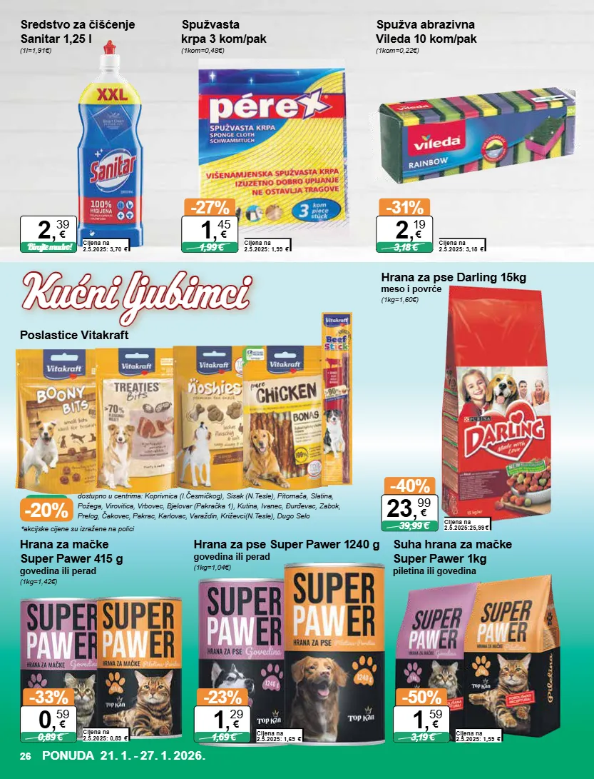 *akcijske cijene su izražene na polici -20% cijena na 2.5.2025:25,99 € cijena na 2.5.2025: 1,59 € cijena na 2.5.2025: 0,89 € cijena na 2.5.2025: 1,69 € cijena na 2.5.2025: 3,70 € cijena na 2.5.2025: 1,99 € cijena na 2.5.2025: 3,18 € hrana za pse darling 15kg meso i povrće (1kg=1,60€) -40% 39,99 € 23 , 99 € poslastice vitakraft suha hrana za mačke super pawer 1kg piletina ili govedina -50% 3,19 € 1 , 59 € hrana za mačke super pawer 415 g govedina ili perad (1kg=1,42€) -33% 0,89 € 0 , 59 € hrana za pse super pawer 1240 g govedina ili perad (1kg=1,04€) -23% 1,69 € 1 , 29 € dostupno u centrima: koprivnica (i.česmičkog), sisak (n.tesle), pitomača, slatina, požega, virovitica, vrbovec, bjelovar (pakračka 1), kutina, ivanec, đurđevac, zabok, prelog, čakovec, pakrac, karlovac, varaždin, križevci(n.tesle), dugo selo sredstvo za čišćenje sanitar 1,25 l (1l=1,91€) birajte mudro! 2 , 39 € spužvasta krpa 3 kom/pak (1kom=0,48€) -27% 1,99 € 1 , 45 € spužva abrazivna vileda 10 kom/pak (1kom=0,22€) -31% 3,18 € 2 , 19 € ponuda 21. 1. - 27. 1. 2026. 26 kućni ljubimci kućni ljubimci