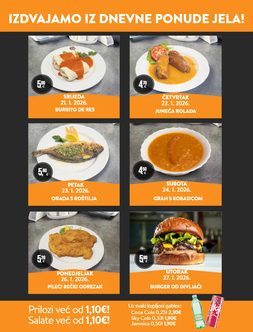 izdvajamo iz dnevne ponude jela! kn petak 23. 1. 2026. orada s roštilja 5, 60 € četvrtak 22. 1. 2026. 4 , 70 € juneća rolada 5 , 80 € srijeda 21. 1. 2026. burrito de res coca cola 0,25l 2,30€ sky cola 0,33l 1,90€ jamnica 0,50l 1,90€ prilozi već od 1,10€! salate već od 1,10€! uz svaki kupljeni gablec: ponedjeljak 26. 1. 2026. 5 , 20 € pileći bečki odrezak 4 , 50 € subota 24. 1. 2026. grah s kobasicom utorak 27. 1. 2026. 5 , 90 € burger od divljači