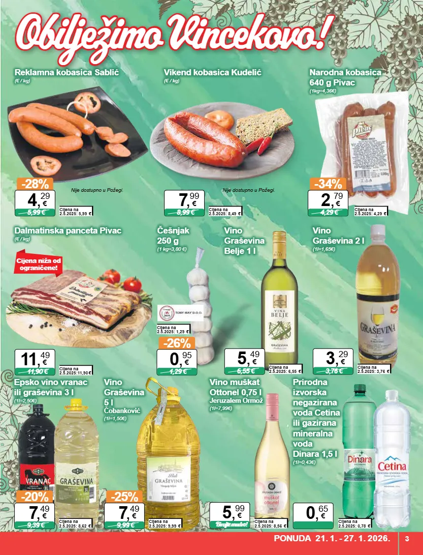 nije dostupno u požegi. nije dostupno u požegi. cijena na 2.5.2025: 8,56 € cijena na 2.5.2025: 0,78 € cijena na 2.5.2025: 6,55 € cijena na 2.5.2025: 3,76 € cijena na 2.5.2025: 8,62 € cijena na 2.5.2025: 9,99 € cijena na 2.5.2025:11,90 € cijena na 2.5.2025: 4,29 € cijena na 2.5.2025: 8,49 € cijena na 2.5.2025: 5,99 € cijena na 2.5.2025: 1,29 € birajte mudro! 5 , 99 € vino muškat ottonel 0,75 l jeruzalem ormož (1l=7,99€) prirodna izvorska negazirana voda cetina ili gazirana mineralna voda dinara 1,5 l (1l=0,43€) 0 , 65 € vino graševina belje 1 l 6,55 € 5 , 49 € vino graševina 2 l (1l=1,65€) 3,76 € 3 , 29 € epsko vino vranac ili graševina 3 l (1l=2,50€) -20% 9,39 € 7 , 49 € vino graševina 5 l čobanković (1l=1,50€) -25% 9,99 € 7 , 49 € cijena niža od ograničene! dalmatinska panceta pivac (€ / kg) 11,90 € 11 , 49 € narodna kobasica 640 g pivac (1kg=4,36€) -34% 4,29 € 2 , 79 € vikend kobasica kudelić (€ / kg) 8,99 € 7 , 99 € reklamna kobasica sablić (€ / kg) -28% 5,99 € 4 , 29 € češnjak 250 g (1 kg=3,80 €) -26% 1,29 € 0 , 95 € ponuda 21. 1. - 27. 1. 2026. 3 obilježimo vincekovo! obilježimo vincekovo!