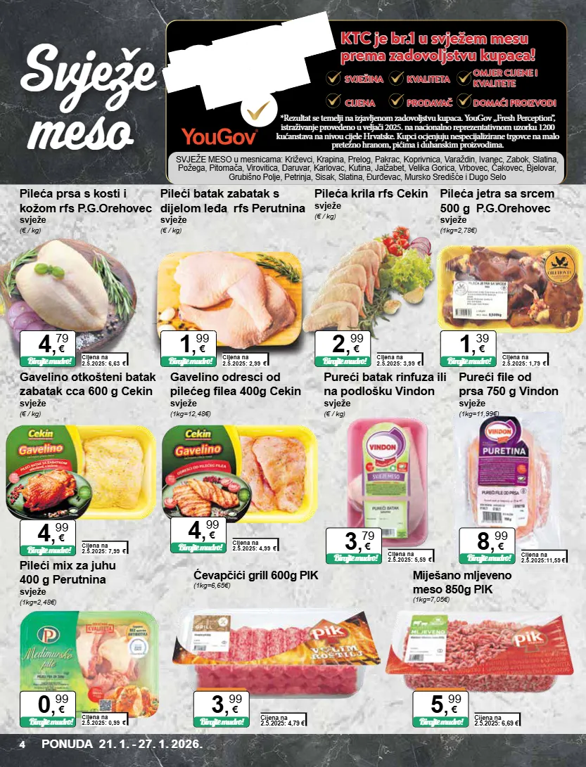 svježe meso u mesnicama: križevci, krapina, prelog, pakrac, koprivnica, varaždin, ivanec, zabok, slatina, požega, pitomača, virovitica, daruvar, karlovac, kutina, jalžabet, velika gorica, vrbovec, čakovec, bjelovar, grubišno polje, petrinja, sisak, slatina, đurđevac, mursko središće i dugo selo ktc je br.1 u svježem mesu ktc je br.1 u svježem mesu prema zadovoljstvu kupaca! prema zadovoljstvu kupaca! *rezultat se temelji na izjavljenom zadovoljstvu kupaca. yougov „fresh perception”, istraživanje provedeno u veljači 2025. na nacionalno reprezentativnom uzorku 1200 kućanstava na nivou cijele hrvatske. kupci ocjenjuju nespecijalizirane trgovce na malo pretežno hranom, pićima i duhanskim proizvodima. domaći proizvodi domaći proizvodi omjer cijene i omjer cijene i kvalitete kvalitete prodavač prodavač kvaliteta kvaliteta svježina svježina cijena cijena potvrdili kupci cijena na 2.5.2025: 6,63 € cijena na 2.5.2025: 1,79 € cijena na 2.5.2025: 2,99 € cijena na 2.5.2025: 0,99 € cijena na 2.5.2025: 7,99 € cijena na 2.5.2025: 5,59 € cijena na 2.5.2025: 4,99 € cijena na 2.5.2025:11,59 € cijena na 2.5.2025: 3,99 € cijena na 2.5.2025: 6,69 € cijena na 2.5.2025: 4,79 € pileća prsa s kosti i kožom rfs p.g.orehovec svježe (€ / kg) birajte mudro! 4 , 79 € pileća jetra sa srcem 500 g p.g.orehovec svježe (1kg=2,78€) birajte mudro! 1 , 39 € pileći batak zabatak s dijelom leđa rfs perutnina svježe (€ / kg) birajte mudro! 1 , 99 € pileći mix za juhu 400 g perutnina svježe (1kg=2,48€) birajte mudro! 0 , 99 € gavelino otkošteni batak zabatak cca 600 g cekin svježe (€ / kg) birajte mudro! 4 , 99 € pureći batak rinfuza ili na podlošku vindon svježe (€ / kg) birajte mudro! 3 , 79 € gavelino odresci od pilećeg filea 400g cekin svježe (1kg=12,48€) birajte mudro! 4 , 99 € pureći file od prsa 750 g vindon svježe (1kg=11,99€) birajte mudro! 8 , 99 € pileća krila rfs cekin svježe (€ / kg) birajte mudro! 2 , 99 € miješano mljeveno meso 850g pik (1kg=7,05€) ćevapčići grill 600g pik (1kg=6,65€) birajte mudro! 5 , 99 € birajte mudro! 3 , 99 € ponuda 21. 1. - 27. 1. 2026. 4 svježe meso