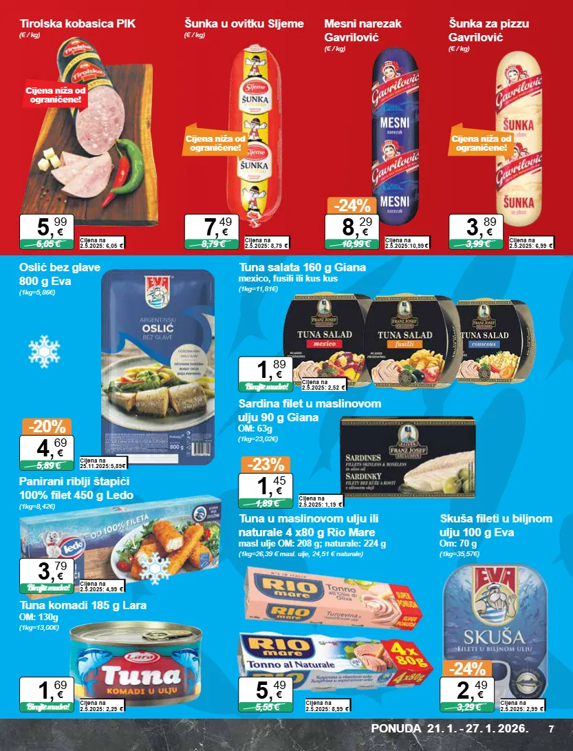 cijena na 2.5.2025: 8,79 € cijena na 2.5.2025: 6,99 € cijena na 2.5.2025:10,99 € cijena na 2.5.2025: 4,99 € cijena na 2.5.2025: 2,52 € cijena na 2.5.2025: 1,19 € cijena na 2.5.2025: 2,99 € cijena na 25.11.2025:5,89 € cijena na 2.5.2025: 2,29 € cijena na 2.5.2025: 8,99 € cijena na 2.5.2025: 6,05 € cijena niža od ograničene! cijena niža od ograničene! šunka u ovitku sljeme (€ / kg) 8,79 € 7 , 49 € šunka za pizzu gavrilović (€ / kg) 3,99 € 3 , 89 € mesni narezak gavrilović (€ / kg) -24% 10,99 € 8 , 29 € panirani riblji štapići 100% filet 450 g ledo (1kg=8,42€) birajte mudro! 3 , 79 € tuna salata 160 g giana mexico, fusili ili kus kus (1kg=11,81€) birajte mudro! 1 , 89 € sardina filet u maslinovom ulju 90 g giana om: 63g (1kg=23,02€) -23% 1,89 € 1 , 45 € skuša fileti u biljnom ulju 100 g eva om: 70 g (1kg=35,57€) -24% 3,29 € 2 , 49 € oslić bez glave 800 g eva (1kg=5,86€) -20% 5,89 € 4 , 69 € tuna komadi 185 g lara om: 130g (1kg=13,00€) birajte mudro! 1 , 69 € tuna u maslinovom ulju ili naturale 4 x80 g rio mare masl ulje om: 208 g; naturale: 224 g (1kg=26,39 € masl. ulje, 24,51 € naturale) 5,55 € 5 , 49 € cijena niža od ograničene! tirolska kobasica pik (€ / kg) 6,05 € 5 , 99 € ponuda 21. 1. - 27. 1. 2026. 7