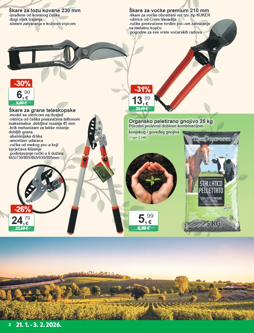 21. 1. - 3. 2. 2026. 2 Škare za lozu kovane 230 mm -izrađene od kovanog čelika -dugi vijek trajanja -sistem zatvaranja s kožnom vrpcom Škare za grane teleskopske -model sa oštricom na dosjed -oštrica od čelika presvučena teflonom maksimalna -debljina rezanja 45 mm -krik mehanizam za lakše rezanje debljih grana -aluminijska drška -amortizer udaraca -ručka od mekog pvc-a koji sprječava klizanje -podešavanje ručki u 6 dužina: 665/730/805/865/930/995mm Škare za voćke premium 210 mm -škare za voćke obostrani rez tzv. tip KUKER -oštrice od Crom-Vanadija -ručke presvučene tvrdim pvc-om zatvaranje na metalnu kopču -pogodne za sve vrste voćarskih radova Organsko peletirano gnojivo 25 kg Prirodni proizvod dobiven kombinacijom konjskog i goveđeg gnojiva ( 1 kg= 0,24€) - 30 % 9,99 € 6 , 99 € - 26 % 33,69 € 24 , 79 € - 31 % 20,19 € 13 , 89 € 6,99 € 5 , 99 €