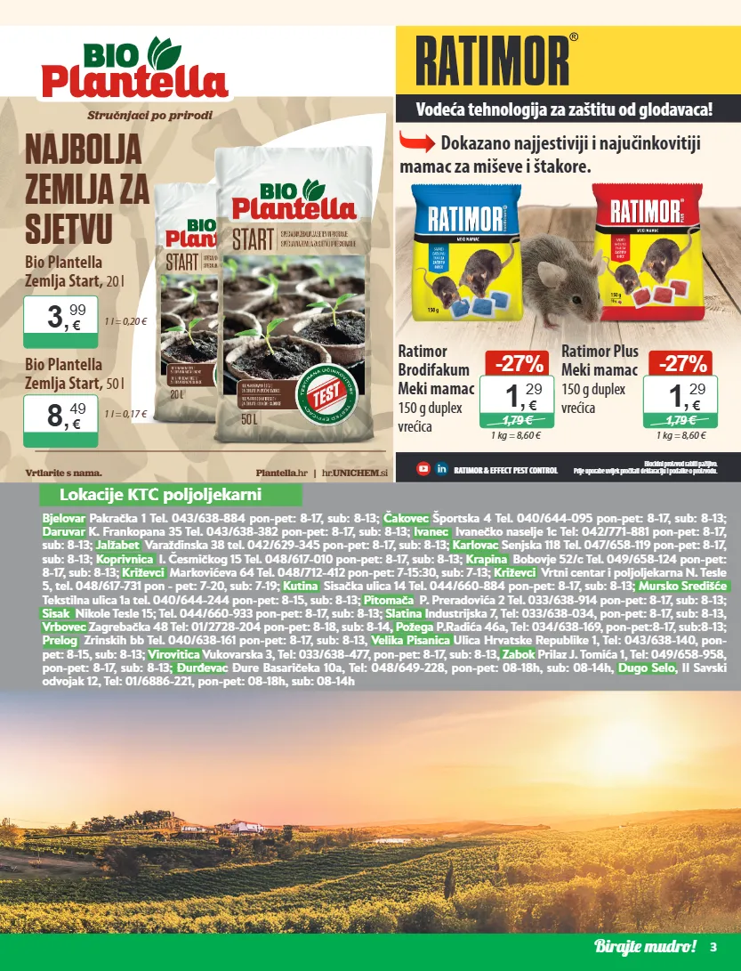 birajte mudro! 3 lokacije ktc poljoljekarni bjelovar pakračka 1 tel. 043/638-884 pon-pet: 8-17, sub: 8-13; čakovec športska 4 tel. 040/644-095 pon-pet: 8-17, sub: 8-13 ; daruvar k. frankopana 35 tel. 043/638-382 pon-pet: 8-17, sub: 8-13 ; ivanec ivanečko naselje 1c tel: 042/771-881 pon-pet: 8-17, sub: 8-13; jalžabet varaždinska 38 tel. 042/629-345 pon-pet: 8-17, sub: 8-13; karlovac senjska 118 tel. 047/658-119 pon-pet: 8-17, sub: 8-13; koprivnica i. česmičkog 15 tel. 048/617-010 pon-pet: 8-17, sub: 8-13; krapina bobovje 52/c tel. 049/658-124 pon-pet: 8-17, sub: 8-13; križevci markovićeva 64 tel. 048/712-412 pon-pet: 7-15:30, sub: 7-13; križevci vrtni centar i poljoljekarna n. tesle 5, tel. 048/617-731 pon - pet: 7-20, sub: 7-19; kutina sisačka ulica 14 tel. 044/660-884 pon-pet: 8-17, sub: 8-13 ; mursko središće tekstilna ulica 1a tel. 040/644-244 pon-pet: 8-15, sub: 8-13; pitomača p. preradovića 2 tel. 033/638-914 pon-pet: 8-17, sub: 8-13; sisak nikole tesle 15; tel. 044/660-933 pon-pet: 8-17, sub: 8-13; slatina industrijska 7, tel: 033/638-034, pon-pet: 8-17, sub: 8-13, vrbovec zagrebačka 48 tel: 01/2728-204 pon-pet: 8-18, sub: 8-14, požega p.radića 46a, tel: 034/638-169, pon-pet:8-17, sub:8-13; prelog zrinskih bb tel. 040/638-161 pon-pet: 8-17, sub: 8-13, velika pisanica ulica hrvatske republike 1, tel: 043/638-140, pon- pet: 8-15, sub: 8-13; virovitica vukovarska 3, tel: 033/638-477, pon-pet: 8-17, sub: 8-13, zabok prilaz j. tomića 1, tel: 049/658-958, pon-pet: 8-17, sub: 8-13; đurđevac đure basaričeka 10a, tel: 048/649-228, pon-pet: 08-18h, sub: 08-14h, dugo selo, ii savski odvojak 12, tel: 01/6886-221, pon-pet: 08-18h, sub: 08-14h ratimor & effect pest control vodeća tehnologija za zaštitu od glodavaca! ratimor plus meki mamac 150 g duplex vrećica ratimor brodifakum meki mamac 150 g duplex vrećica biocidni proizvod rabiti pažljivo. prije uporabe uvijek pročitati deklaraciju i podatke o proizvodu. dokazano najjestiviji i najučinkovitiji mamac za miševe i štakore. stručnjaci po prirodi bio plantella zemlja start, 20 l 1 l = 0,20 € 1 l = 0,17 € 1 kg = 8,60 € 1 kg = 8,60 € bio plantella zemlja start, 50 l najbolja zemlja za sjetvu vrtlarite s nama. plantella .hr | hr. unichem .si 3 , 99 € 8 , 49 € - 27 % 1,79 € 1 , 29 € - 27 % 1,79 € 1 , 29 €