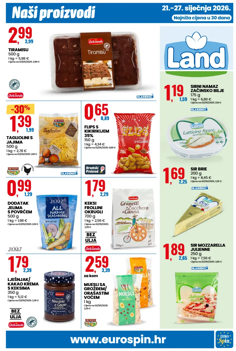 www.eurospin.hr naši proizvodi 21.-27. siječnja 2026. najniža cijena u 30 dana 1 , 39 1,99 -30 % tagliolini s jajima 500 g 1 kg = 2,78 € cijena na 02/05/2025: 1,99 € 2 , 99 3,99 tiramisu 500 g 1 kg = 5,98 € cijena na 02/05/2025: 3,99 € 0 , 99 1,29 dodatak jelima s povrćem 500 g 1 kg = 1,98 € cijena na 02/05/2025: 1,09 € 0 , 65 0,89 flips s kikirikijem 35% 150 g 1 kg = 4,34 € cijena na 02/05/2025: 0,89 € 1 , 79 2,29 keksi frollini okrugli 700 g 1 kg = 2,56 € cijena na 02/05/2025: 2,29 € 1 , 79 2,39 lješnjak/ kakao krema s keksima 350 g 1 kg = 5,12 € cijena na 02/05/2025: 2,39 € 2 , 59 3,39 za kom muesli sa grožðem/ orašastim voćem 1 kg cijena na 02/05/2025: 3,39 € 1 , 19 1,59 sirni namaz začinsko bilje 175 g 1 kg = 6,80 € cijena na 02/05/2025: 1,59 € 1 , 69 2,25 sir brie 200 g 1 kg = 8,45 € cijena na 02/05/2025: 2,25 € 1 , 89 2,65 sir mozzarella julienne 250 g 1 kg = 7,56 € cijena na 02/05/2025: 2,65 €