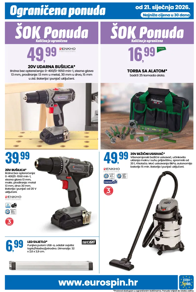 www.eurospin.hr ograničena ponuda *proizvod dostupan u ograničenim količinama. ponuda vrijedi do isteka zaliha. od 21. siječnja 2026. najniža cijena u 30 dana torba sa alatom* sadrži 25 komada alata. 16 , 99 20v udarna bušilica* brzina bez opterećenja: 0-400/0-1650 min-1, stezna glava 13 mm, prodiranje: 13 mm u metal, 30 mm u drvo, 15 mm u zid. baterija i punjač uključeni. 49 , 99 20v bušilica* brzina bez opterećenja: 0-400/0-1550 min-1, stezna glava 13 mm, maks. prodiranje: metal 13 mm, drvo 30 mm. baterija i punjač od 20 v uključeni. 39 , 99 20v bežični usisivač* višenamjenski bežični usisavač, učinkovito uklanja mokru i suhu prljavštinu, spremnik od 20 l, 4 kotača. moć usisavanja 8kpa, autonomija baterije 15 min. baterija i punjač uključeni. 49 , 99 led svjetlo* punjiva putem usb-a, odabir svjetla: toplo/hladno/prirodno. dimenzije: 32 x 2,6 x 3,9 cm. 6 , 99