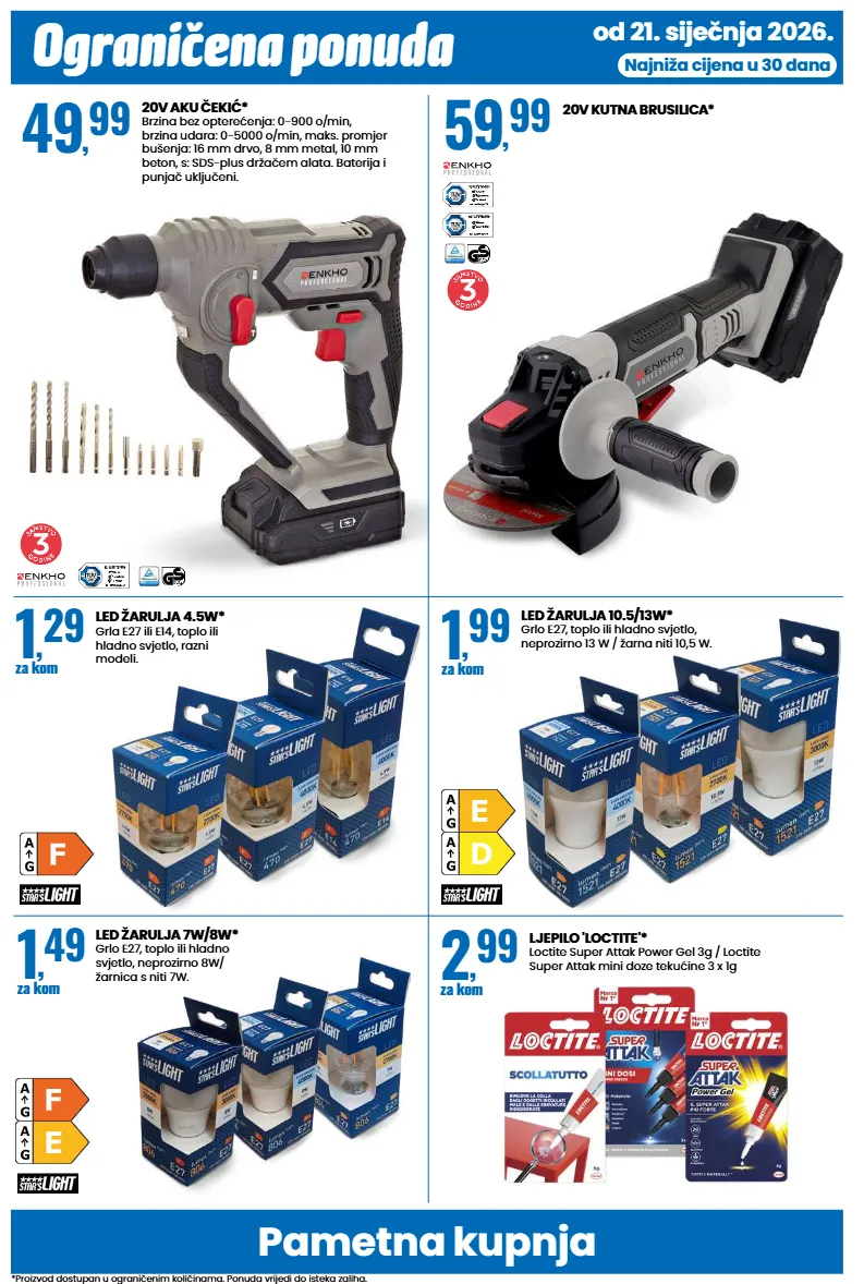 pametna kupnja ograničena ponuda *proizvod dostupan u ograničenim količinama. ponuda vrijedi do isteka zaliha. od 21. siječnja 2026. najniža cijena u 30 dana 20v aku čekić* brzina bez opterećenja: 0-900 o/min, brzina udara: 0-5000 o/min, maks. promjer bušenja: 16 mm drvo, 8 mm metal, 10 mm beton, s: sds-plus držačem alata. baterija i punjač uključeni. 49 , 99 20v kutna brusilica* 59 , 99 led žarulja 10.5/13w* grlo e27, toplo ili hladno svjetlo, neprozirno 13 w / žarna niti 10,5 w. 1 , 99 za kom led žarulja 7w/8w* grlo e27, toplo ili hladno svjetlo, neprozirno 8w/ žarnica s niti 7w. 1 , 49 za kom led žarulja 4.5w* grla e27 ili e14, toplo ili hladno svjetlo, razni modeli. 1 , 29 za kom ljepilo 'loctite'* loctite super attak power gel 3g / loctite super attak mini doze tekućine 3 x 1g 2 , 99 za kom