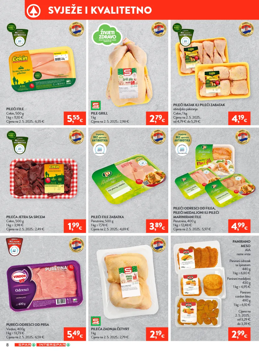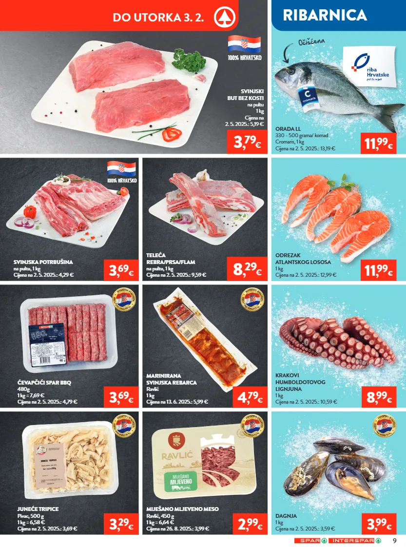 9 svinjski but bez kosti na pultu 1 kg cijena na 2. 5. 2025.: 5,19 € do utorka 3. 2. 11 , 99 € odrezak atlantskog lososa 1 kg cijena na 2. 5. 2025.: 12,99 € 11 , 99 € orada ll 330 - 500 grama/ komad cromaris, 1 kg cijena na 2. 5. 2025.: 13,19 € 8 , 99 € krakovi humboldotovog lignjuna 1 kg cijena na 2. 5. 2025.: 10,59 € 3 , 99 € dagnja 1 kg cijena na 2. 5. 2025.: 3,59 € ribarnica marinirana svinjska rebarca ravlić 1 kg cijena na 13. 6. 2025.: 5,99 € 4 , 79 € ćevapčići spar bbq 480g 1 kg = 7,69 € cijena na 2. 5. 2025.: 4,79 € svinjska potrbušina na pultu, 1 kg cijena na 2. 5. 2025.: 4,29 € 3 , 69 € 3 , 69 € miješano mljeveno meso ravlić, 450 g 1 kg = 6,64 € cijena na 26. 8. 2025.: 3,99 € 2 , 99 € juneće tripice pivac, 500 g 1 kg = 6,58 € cijena na 2. 5. 2025.: 3,69 € 3 , 29 € teleća rebra/prsa/flam na pultu, 1 kg cijena na 2. 5. 2025.: 9,59 € 8 , 29 € 100% hrvatsko 100% hrvatsko očišćena 3 , 79 €
