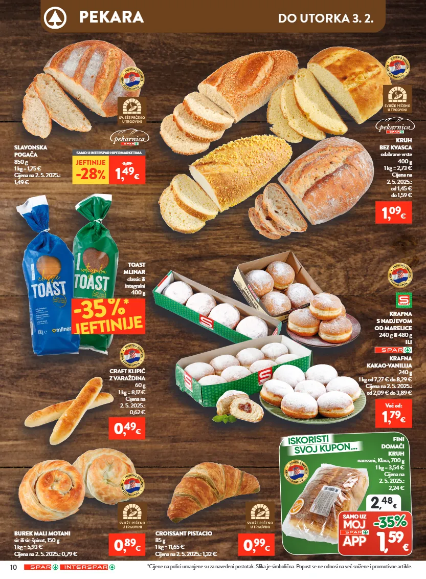 10 *cijene na polici umanjene su za navedeni postotak. slika je simbolična. popust se ne odnosi na već snižene i promotivne artikle. kruh bez kvasca odabrane vrste 400 g 1 kg = 2,73 € cijena na 2. 5. 2025.: od 1,45 € do 1,59 € toast mlinar classic ili integralni 400 g craft klipić z varaždina 60 g 1 kg = 8,17 € cijena na 2. 5. 2025.: 0,62 € krafna s nadjevom od marelice 240 g ili 480 g ili krafna kakao-vanilija 240 g 1 kg od 7,27 € do 8,29 € cijena na 2. 5. 2025.: od 2,09 € do 3,89 € croissant pistacio 85 g 1 kg = 11,65 € cijena na 2. 5. 2025.: 1,32 € 2 , 48 € samo uz 1 , 59 € -35% -35% iskoristi svoj kupon... fini domaći kruh narezani, klara, 700 g 1 kg = 3,54 € cijena na 2. 5. 2025.: 2,24 € slavonska pogača 850 g 1 kg = 1,75 € cijena na 2. 5. 2025.: 1,49 € jeftinije -28 % 2,09 1 , 49 € samo u interspar hipermarketima 1 , 09 € 0 , 49 € burek mali motani sir ili sir-špinat, 150 g 1 kg = 5,93 € cijena na 2. 5. 2025.: 0,79 € 0 , 89 € 0 , 99 € -35 % * jeftinije već od: 1 , 79 € pekara do utorka 3. 2.