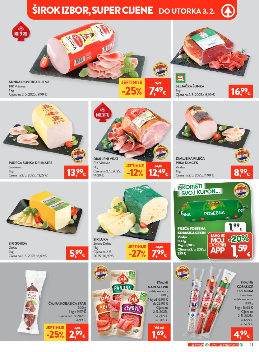 iskoristi svoj kupon... širok izbor, super cijene do utorka 3. 2. 11 pileća posebna kobasica cekin vindija 500 g 1 kg = 3,98 € cijena na 2. 5. 2025.: 1,99 € jeftinije -25 % 3,99 2 , 99 € seljačka šunka 1 kg cijena na 2. 5. 2025.: 16,99 € sir gouda dukat 1 kg cijena na 2. 5. 2025.: 6,49 € trajne kobasice premium gavrilović odabrane vrste 300 g 1 kg = 16,63 € cijena na 2. 5. 2025.: od 4,99 € do 6,69 € sir luka zelene doline 1 kg cijena na 2. 5. 2025.: 10,99 € dimljeni vrat pik vrbovec 1 kg cijena na 2. 5. 2025.: 14,29 € pureća šunka delikates gavrilović 1 kg cijena na 2. 5. 2025.: 13,29 € dimljena pileća prsa dimcek vindija 1 kg cijena na 2. 5. 2025.: 11,99 € šunka u ovitku sljeme pik vrbovec 1 kg cijena na 2. 5. 2025.: 9,99 € 1 , 99 € samo uz 1 , 59 € -20% -20% 5 , 99 € 4 , 99 € 16 , 99 € 8 , 99 € 13 , 99 € jeftinije -12 % 14,29 12 , 49 € jeftinije -27 % 10,99 7 , 99 € trajni naresci pik odabrane vrste 100 g 1 kg od 16,90 € do 25,90 € cijena na 2. 5. 2025.: od 2,09 € do 3,05 € čajna kobasica spar 300 g 1 kg = 9,97 € cijena na 1. 8. 2025.: 4,99 € već od: 1 , 69 € jeftinije -25 % 9,99 7 , 49 €