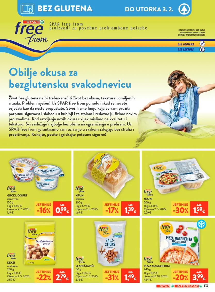 s p a r f r e e f r o m p r o i z v o d i z a p o s e b n e p r e h r a m b e n e p o t r e b e bez glutena bez laktoze svi proizvodi spar free from prolaze dodatne redovite interne i vanjske kontrole u ovlaštenim labaratorijima. obilje okusa za bezglutensku svakodnevicu život bez glutena ne bi trebao značiti život bez okusa, tekstura i omiljenih rituala. problem riješen! uz spar free from ponudu nikad se nećete osjećati kao da nešto propuštate. stvorili smo liniju koja će vam pružiti potpunu sigurnost i slobodu u kuhinji i za stolom i redovno ju širimo novim proizvodima. kod razvijanja novih okusa uvijek mislimo na kvalitetu i teksturu. svi zaslužuju najbolje bez obzira na ograničenja u prehrani. uz spar free from garantiramo vam uživanje u svakom zalogaju bez straha i propitivanja. kuhajte, pecite i grickajte potpuno sigurno! do utorka 3. 2. bez glutena jeftinije -16 % 1,19 0 , 99 € jeftinije -22 % 3,59 2 , 79 € jeftinije -17 % 1,69 1 , 39 € jeftinije -31 % 2,19 1 , 49 € jeftinije -30 % 2,29 1 , 59 € jeftinije -20 % 4,99 3 , 99 € keksi riža kakao 250 g 1 kg = 11,16 € cijena na 2. 5. 2025.: 3,59 € slani štapići 110 g 1 kg = 13,55 € cijena na 2. 5. 2025.: 2,14 € pizza margherita 340 g 1 kg = 11,74 € cijena na 16. 10. 2025.: 4,99 € grčki jogurt razne vrste 150 g 1 kg = 6,60 € cijena na 2. 7. 2025.: 1,19 € kruh narezani 200 g 1 kg = 6,95 € cijena na 2. 5. 2025.: 1,69 € njoki 500 g 1 kg = 3,18 € cijena na 2. 5. 2025.: 2,29 €