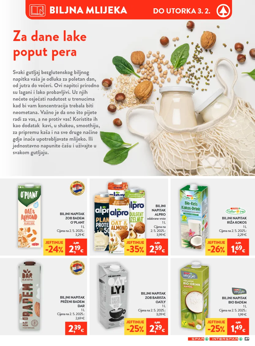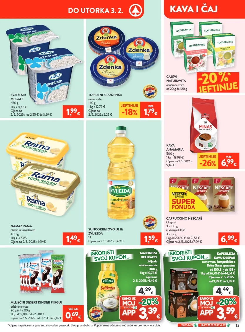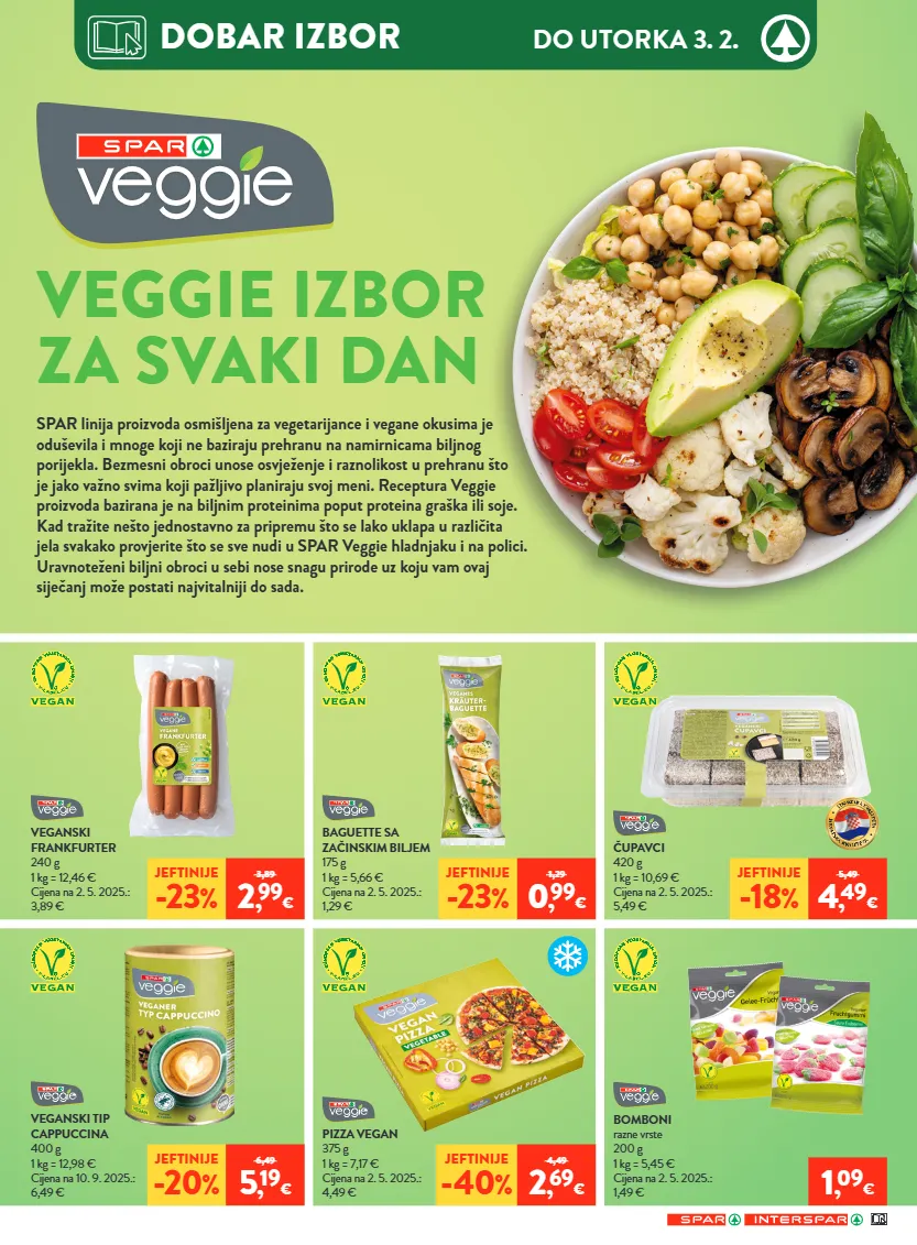 važenje letka je od 28.1.2026. do 3.2.2026. ili do prodaje zaliha za prehrambene namirnice, kozmetiku, proizvode za osobnu higijenu i sredstva za čišćenje, te od 28.1.2026. do 10.2.2026. ili do prodaje zaliha za kućanstvo, tekstil, tehniku, sport, hobi program, cvijeće, školu i ured. akcijske cijene ne vrijede u spar jurišićeva 2a, zagreb. zbog ograničenosti prostora svi proizvodi iz neprehrambenog asortimana nisu dostupni u interspar hipermarketima u samoboru, puli, zadru, ante starčevića 5a i osijek - portanova. zbog ograničenosti prostora svi proizvodi nisu dostupni u svim spar supermarketima. proizvode iz ovog letka moguće je kupiti samo u količinama za kućanstvo. ne odgovaramo za moguće tiskarske greške! izraženi postotak sniženja je minimalan. sve cijene izražene su u eurima s pdv-om. *cijene na polici umanjene su za navedeni postotak. slika je simbolična. popust se ne odnosi na već snižene i promotivne artikle. poštvani kupci! pritužbe i pohvale besplatni telefon 0800 7727 – info @spar.hr 05/26 super početak tjedna ponedjeljak 26. 1. i utorak 27. 1. super početak tjedna ponedjeljak 2. 2. i utorak 3. 2. iskoristi svoj kupon... iskoristi svoj kupon... 1 , 39 € 7 , 49 € 1 , 29 € 3 , 59 € juneći vrat bez kosti na pultu 1 kg cijena na 2. 5. 2025.: 10,49 € 12 , 49 € kisela vrhnja dukat 200 g do 900 g kruška williams rinfuza 1 kg cijena na 2. 5. 2025.: 1,39 € -20 % * jeftinije u cijenu uključena povratna naknada po limenci jeftinije -12 % ?,99 6 , 99 € jeftinije -20 % 4,39 3 , 49 € jeftinije -30 % 9,99 6 , 99 € pivo ožujsko 6 x 0,5 l 1 l = 2,33 € cijena na 2. 5. 2025.: 8,17 € žitna kašica čokolino 1,4 kg 1 kg = 5,35 € cijena na 2. 5. 2025.: 7,49 € kava franck jubilarna 175 g 1 kg = 19,94 € cijena na 2. 5. 2025.: 4,49 € sir tilzit ammerland 1 kg cijena na 2. 5. 2025.: 9,99 € vikend ponuda od petka 30. 1. do nedjelje 1. 2. naranča natalija rinfuza 1 kg cijena na 29. 10. 2025.: 1,99 € svinjska leđa s kosti na pultu 1 kg cijena na 2. 5. 2025.: 4,29 € ekstra djevičanska maslinova ulja robne marke premium, despar ili natur*pur -25 % * jeftinije samo uz -25% -25% igračke i knjige samo uz -25% -25% folije, vrećice, papiri za pečenje 100% hrvatsko
