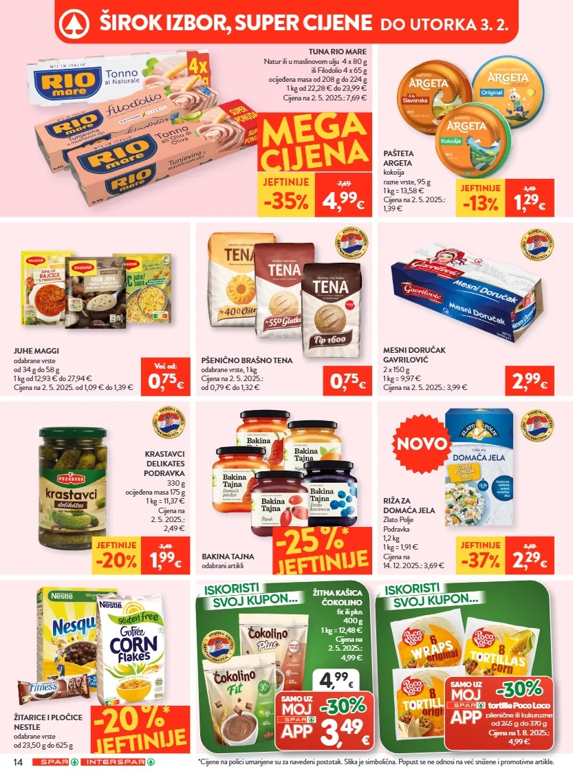 14 žitna kašica čokolino fit ili plus 400 g 1 kg = 12,48 € cijena na 2. 5. 2025.: 4,99 € 4 , 99 € samo uz 3 , 49 € -30% -30% tuna rio mare natur ili u maslinovom ulju 4 x 80 g ili filodolio 4 x 65 g ocijeđena masa od 208 g do 224 g 1 kg od 22,28 € do 23,99 € cijena na 2. 5. 2025.: 7,69 € juhe maggi odabrane vrste od 34 g do 58 g 1 kg od 12,93 € do 27,94 € cijena na 2. 5. 2025. od 1,09 € do 1,39 € pšenično brašno tena odabrane vrste, 1 kg cijena na 2. 5. 2025.: od 0,79 € do 1,32 € pašteta argeta kokošja razne vrste, 95 g 1 kg = 13,58 € cijena na 2. 5. 2025.: 1,39 € krastavci delikates podravka 330 g ocijeđena masa 175 g 1 kg = 11,37 € cijena na 2. 5. 2025.: 2,49 € žitarice i pločice nestle odabrane vrste od 23,50 g do 625 g mesni doručak gavrilović 2 x 150 g 1 kg = 9,97 € cijena na 2. 5. 2025.: 3,99 € riža za domaća jela zlato polje podravka 1,2 kg 1 kg = 1,91 € cijena na 14. 12. 2025.: 3,69 € *cijene na polici umanjene su za navedeni postotak. slika je simbolična. popust se ne odnosi na već snižene i promotivne artikle. mega cijena jeftinije -35 % 7,69 4 , 99 € širok izbor, super cijene do utorka 3. 2. jeftinije -37 % 3,69 2 , 29 € jeftinije -13 % 1,49 1 , 29 € jeftinije -20 % 2,49 1 , 99 € -20 % * jeftinije -25 % * jeftinije samo uz -30% -30% tortille poco loco pšenične ili kukuruzne od 245 g do 370 g cijena na 1. 8. 2025.: 4,99 € iskoristi svoj kupon... iskoristi svoj kupon... novo bakina tajna odabrani artikli 0 , 75 € 2 , 99 € već od: 0 , 75 €