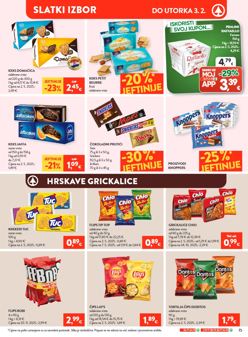 slatki izbor do utorka 3. 2. 15 praline raffaello ferrero 150 g 1 kg = 31,93 € cijena na 2. 5. 2025.: 4,29 € iskoristi svoj kupon... keks domaćica odabrane vrste od 220 g do 300 g 1 kg od 8,17 € do 11,14 € cijena na 2. 5. 2025.: 2,49 € proizvodi knoppers krekeri tuc razne vrste 100 g 1 kg = 8,90 € cijena na 2. 5. 2025.: 0,89 € flips tip top odabrane vrste od 40 g do 50 g 1 kg od 17,80 € do 22,25 € cijena na 2. 5. 2025.: 0,89 € cijena na 7. 5. 2025.: od 1,19 € do 1,84 € grickalice chio odabrane vrste od 80 g do 225 g 1 kg od 7,78 € do 12,38 € cijena na 2. 5. 2025.: od 1,29 € do 1,99 € cijena na 24. 10. 2025.: 2,29 € keks petit beurre kraš odabrane vrste keks jaffa razne vrste od 150 g do 158 g 1 kg od 6,90 € do 7,27 € cijena na 2. 5. 2025.: 1,49 € čokoladni prutići twix 75 g ili 3 x 50 g, snickers 112,5 g ili 3 x 50 g ili mars 70 g ili 3 x 45 g *cijene na polici umanjene su za navedeni postotak. slika je simbolična. popust se ne odnosi na već snižene i promotivne artikle. već od: 0 , 99 € jeftinije -21 % 1,39 1 , 09 € jeftinije -23 % 3,19 2 , 45 € 4 , 79 € samo uz 3 , 39 € -29% -29% -30 % * jeftinije -20 % * jeftinije -25 % * jeftinije flips bobi 4 x 90 g 1 kg = 8,31 € cijena na 20. 11. 2025.: 2,99 € čips lay’s odabrane vrste od 120 g do 130 g 1 kg od 14,54 € do 15,75 € cijena na 2. 5. 2025.: 1,89 € tortilja čips doritos odabrane vrste 90 g 1 kg = 19,89 € cijena na 2. 5. 2025.: 2,39 € 2 , 99 € 1 , 89 € 1 , 79 € hrskave grickalice 0 , 89 € 0 , 89 €