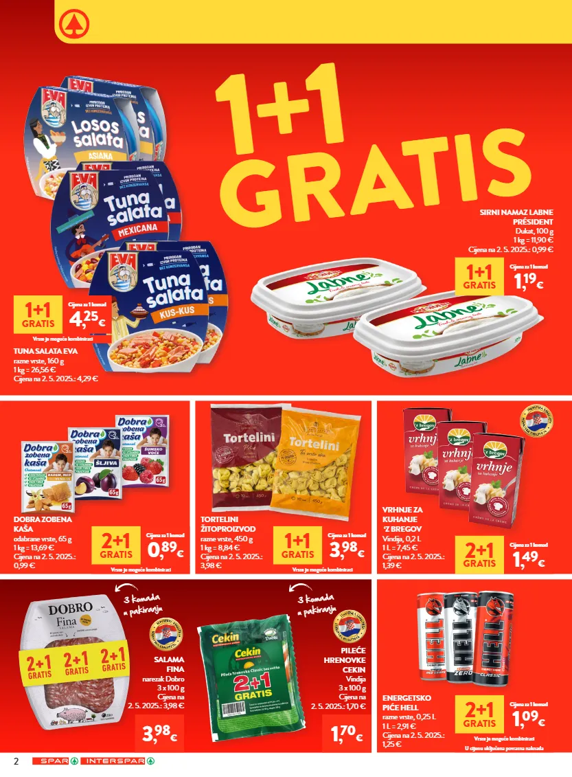 2 1+1 gratis sirni namaz labne président dukat, 100 g 1 kg = 11,90 € cijena na 2. 5. 2025.: 0,99 € 1+1 gratis cijena za 1 komad 1 , 19 € vrhnje za kuhanje ‘z bregov vindija, 0,2 l 1 l = 7,45 € cijena na 2. 5. 2025.: 1,39 € 2+1 gratis cijena za 1 komad 1 , 49 € tuna salata eva razne vrste, 160 g 1 kg = 26,56 € cijena na 2. 5. 2025.: 4,29 € 1+1 gratis cijena za 1 komad 4 , 25 € vrste je moguće kombinirati dobra zobena kaša odabrane vrste, 65 g 1 kg = 13,69 € cijena na 2. 5. 2025.: 0,99 € 2+1 gratis cijena za 1 komad 0 , 89 € vrste je moguće kombinirati tortelini žitoproizvod razne vrste, 450 g 1 kg = 8,84 € cijena na 2. 5. 2025.: 3,98 € 1+1 gratis cijena za 1 komad 3 , 98 € vrste je moguće kombinirati energetsko piće hell razne vrste, 0,25 l 1 l = 2,91 € cijena na 2. 5. 2025.: 1,25 € 2+1 gratis cijena za 1 komad 1 , 09 € u cijenu uključena povratna naknada vrste je moguće kombinirati salama fina narezak dobro 3 x 100 g cijena na 2. 5. 2025.: 3,98 € 3 , 98 € pileće hrenovke cekin vindija 3 x 100 g cijena na 2. 5. 2025.: 1,70 € 1 , 70 € 3 komada u pakiranju 3 komada u pakiranju