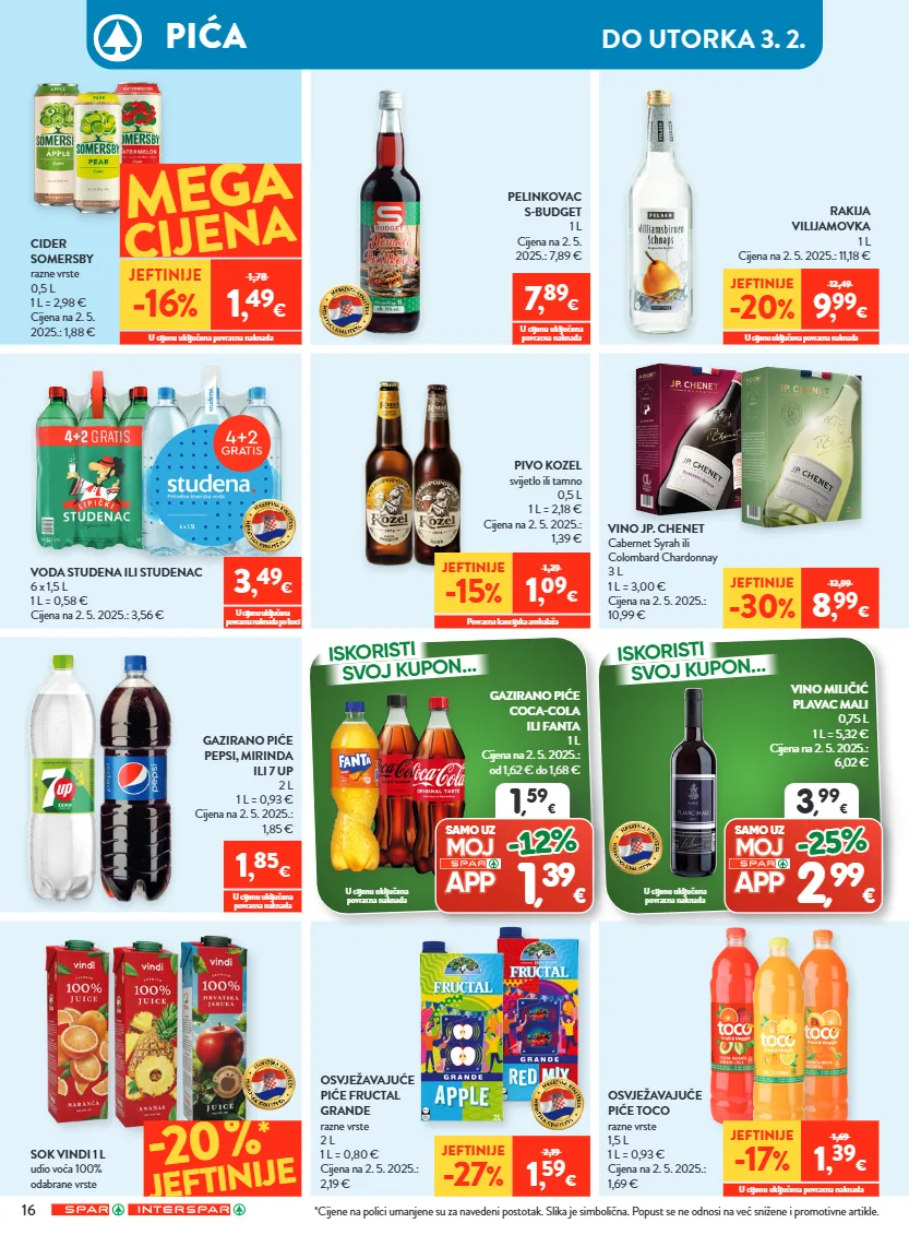 16 3 , 99 € samo uz 2 , 99 € -25% -25% iskoristi svoj kupon... iskoristi svoj kupon... pića do utorka 3. 2. cider somersby razne vrste 0,5 l 1 l = 2,98 € cijena na 2. 5. 2025.: 1,88 € voda studena ili studenac 6 x 1,5 l 1 l = 0,58 € cijena na 2. 5. 2025.: 3,56 € pelinkovac s-budget 1 l cijena na 2. 5. 2025.: 7,89 € gazirano piće pepsi, mirinda ili 7 up 2 l 1 l = 0,93 € cijena na 2. 5. 2025.: 1,85 € vino jp. chenet cabernet syrah ili colombard chardonnay 3 l 1 l = 3,00 € cijena na 2. 5. 2025.: 10,99 € rakija vilijamovka 1 l cijena na 2. 5. 2025.: 11,18 € jeftinije -30 % 12,99 8 , 99 € u cijenu uključena povratna naknada jeftinije -20 % 12,49 9 , 99 € povratna kaucijska ambalaža jeftinije -15 % 1,29 1 , 09 € vino miličić plavac mali 0,75 l 1 l = 5,32 € cijena na 2. 5. 2025.: 6,02 € gazirano piće coca-cola ili fanta 1 l cijena na 2. 5. 2025.: od 1,62 € do 1,68 € pivo kozel svijetlo ili tamno 0,5 l 1 l = 2,18 € cijena na 2. 5. 2025.: 1,39 € u cijenu uključena povratna naknada u cijenu uključena povratna naknada u cijenu uključena povratna naknada po boci 3 , 49 € u cijenu uključena povratna naknada 1 , 85 € u cijenu uključena povratna naknada 7 , 89 € *cijene na polici umanjene su za navedeni postotak. slika je simbolična. popust se ne odnosi na već snižene i promotivne artikle. u cijenu uključena povratna naknada mega cijena jeftinije -16 % 1,78 1 , 49 € 1 , 59 € samo uz 1 , 39 € -12% -12% -20 % * jeftinije u cijenu uključena povratna naknada jeftinije -17 % 1,69 1 , 39 € sok vindi 1 l udio voća 100% odabrane vrste osvježavajuće piće fructal grande razne vrste 2 l 1 l = 0,80 € cijena na 2. 5. 2025.: 2,19 € osvježavajuće piće toco razne vrste 1,5 l 1 l = 0,93 € cijena na 2. 5. 2025.: 1,69 € jeftinije -27 % 2,19 1 , 59 €