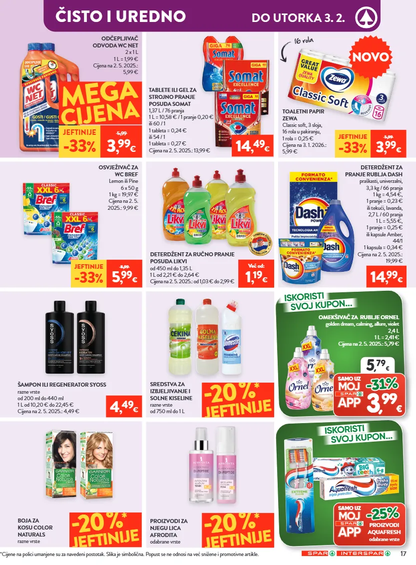 čisto i uredno do utorka 3. 2. 17 iskoristi svoj kupon... iskoristi svoj kupon... 16 rola odčepljivač odvoda wc net 2 x 1 l 1 l = 1,99 € cijena na 2. 5. 2025.: 5,99 € šampon ili regenerator syoss razne vrste od 200 ml do 440 ml 1 l od 10,20 € do 22,45 € cijena na 2. 5. 2025.: 4,49 € proizvodi za njegu lica afrodita odabrane vrste tablete ili gel za strojno pranje posuđa somat 1,37 l / 76 pranja 1 l = 10,58 € / 1 pranje 0,20 € ili 60 / 1 1 tableta = 0,24 € ili 54 / 1 1 tableta = 0,27 € cijena na 2. 5. 2025.: 13,99 € boja za kosu color naturals razne vrste deterdžent za pranje rublja dash praškasti, univerzalni, 3,3 kg / 66 pranja 1 kg = 4,54 €, 1 pranje = 0,23 € ili tekući, lavanda, 2,7 l / 60 pranja 1 l = 5,55 €, 1 pranje = 0,25 € ili kapsule amber, 44/1 1 kapsula = 0,34 € cijena na 2. 5. 2025.: 19,99 € osvježivač za wc bref lemon ili pine 6 x 50 g 1 kg = 19,97 € cijena na 2. 5. 2025.: 9,99 € deterdžent za ručno pranje posuđa likvi od 450 ml do 1,35 l 1 l od 2,21 € do 2,64 € cijena na 2. 5. 2025.: od 1,03 € do 2,99 € toaletni papir zewa classic soft, 3 sloja, 16 rola u pakiranju, 1 rola = 0,25 € cijena na 3. 1. 2026.: 5,99 € sredstva za izbjeljivanje i solne kiseline razne vrste od 750 ml do 1 l jeftinije -33 % 5,99 3 , 99 € jeftinije -33 % 8,99 5 , 99 € već od: 1 , 19 € omekšivač za rublje ornel golden dream, calming, allure, violet 2,4 l 1 l = 2,41 € cijena na 2. 5. 2025.: 5,79 € -20 % * jeftinije -20 % * jeftinije -20 % * jeftinije 14 , 49 € 4 , 49 € 14 , 99 € 5 , 79 € samo uz 3 , 99 € -31% -31% *cijene na polici umanjene su za navedeni postotak. slika je simbolična. popust se ne odnosi na već snižene i promotivne artikle. mega cijena jeftinije -33 % 5,99 3 , 99 € samo uz -25% -25% proizvodi aquafresh odabrane vrste novo