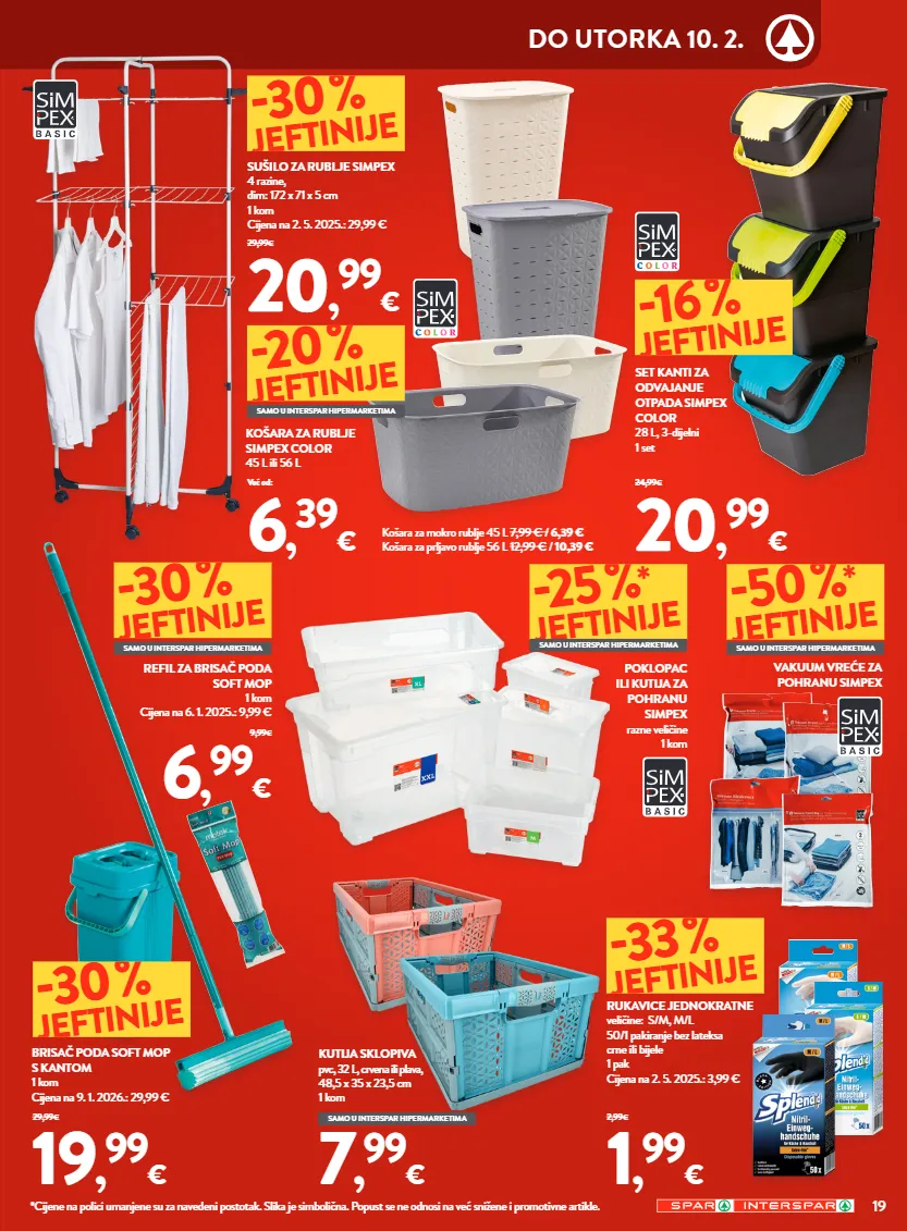 19 do utorka 10. 2. *cijene na polici umanjene su za navedeni postotak. slika je simbolična. popust se ne odnosi na već snižene i promotivne artikle. sušilo za rublje simpex 4 razine, dim: 172 x 71 x 5 cm 1 kom cijena na 2. 5. 2025.: 29,99 € rukavice jednokratne veličine: s/m, m/l 50/1 pakiranje bez lateksa crne ili bijele 1 pak cijena na 2. 5. 2025.: 3,99 € 20 , 99 € 29,99 € 1 , 99 € 2,99 € 29,99 € -30 % jeftinije set kanti za odvajanje otpada simpex color 28 l, 3-dijelni 1 set 20 , 99 € 24,99 € -16 % jeftinije brisač poda soft mop s kantom 1 kom cijena na 9. 1. 2026.: 29,99 € 19 , 99 € refil za brisač poda soft mop 1 kom cijena na 6. 1. 2025.: 9,99 € 6 , 99 € 9,99 € -30 % jeftinije kutija sklopiva pvc, 32 l, crvena ili plava, 48,5 x 35 x 23,5 cm 1 kom 7 , 99 € -33 % jeftinije -30 % jeftinije 6 , 39 € već od: košara za rublje simpex color 45 l ili 56 l -25 % * jeftinije vakuum vreće za pohranu simpex poklopac ili kutija za pohranu simpex razne veličine 1 kom košara za mokro rublje 45 l 7,99 € / 6,39 € košara za prljavo rublje 56 l 12,99 € / 10,39 € -50 % * jeftinije samo u interspar hipermarketima samo u interspar hipermarketima samo u interspar hipermarketima samo u interspar hipermarketima -20 % jeftinije samo u interspar hipermarketima