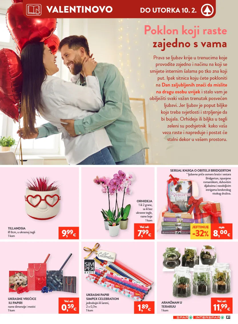 do utorka 10. 2. valentinovo jeftinije -32 % 11,93 8 , 00 € poklon koji raste zajedno s vama prava se ljubav krije u trenucima koje provodite zajedno i načinu na koji se smijete internim šalama po tko zna koji put. ipak sitnica koju ćete pokloniti na dan zaljubljenih znači da mislite na dragu osobu uvijek i stalo vam je obilježiti svaki važan trenutak posvećen ljubavi. jer ljubav je poput biljke koja treba svjetlosti i strpljenje da bi bujala. orhideja ili biljka u tegli zeleni su podsjetnik kako vaša veza raste i napreduje i postat će stalni dekor u vašem prostoru. tillandsia ø 8cm, u ukrasnoj tegli 1 kom ukrasne vrećice ili papiri razne dimenzije i motivi 1 kom orhideja 1 ili 2 grane, sa ili bez ukrasne tegle, razne boje 1 kom ukrasni papir simpex celebration jednobojni ili šareni, 2 x 0,7m 1 kom aranžman u terariju 1 kom već od: 0 , 59 € već od: 7 , 99 € već od: 11 , 99 € 9 , 99 € 1 , 89 € serijal knjiga o obitelji bridgerton * ljubavne priče osmero braće i sestara bridgerton, ispunjene romantikom, duhovitim dijalozima i neodoljivim intrigama londonskog visokog društva.