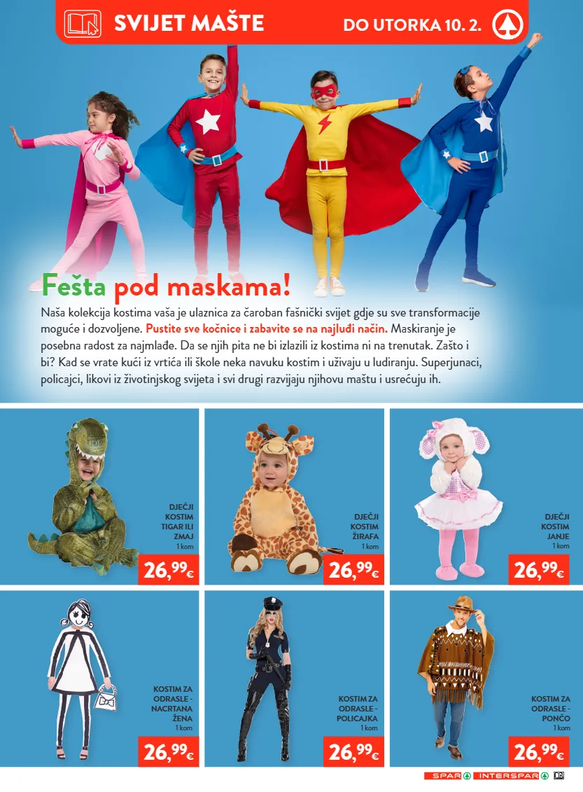 Fešta pod maskama! Naša kolekcija kostima vaša je ulaznica za čaroban fašnički svijet gdje su sve transformacije moguće i dozvoljene. Pustite sve kočnice i zabavite se na najluđi način. Maskiranje je posebna radost za najmlađe. Da se njih pita ne bi izlazili iz kostima ni na trenutak. Zašto i bi? Kad se vrate kući iz vrtića ili škole neka navuku kostim i uživaju u ludiranju. Superjunaci, policajci, likovi iz životinjskog svijeta i svi drugi razvijaju njihovu maštu i usrećuju ih. DO UTORKA 10. 2. SVIJET MAŠTE DJEČJI KOSTIM TIGAR ILI ZMAJ 1 kom KOSTIM ZA ODRASLE - NACRTANA ŽENA 1 kom KOSTIM ZA ODRASLE - POLICAJKA 1 kom KOSTIM ZA ODRASLE - PONČO 1 kom DJEČJI KOSTIM ŽIRAFA 1 kom DJEČJI KOSTIM JANJE 1 kom 26 , 99 € 26 , 99 € 26 , 99 € 26 , 99 € 26 , 99 € 26 , 99 €