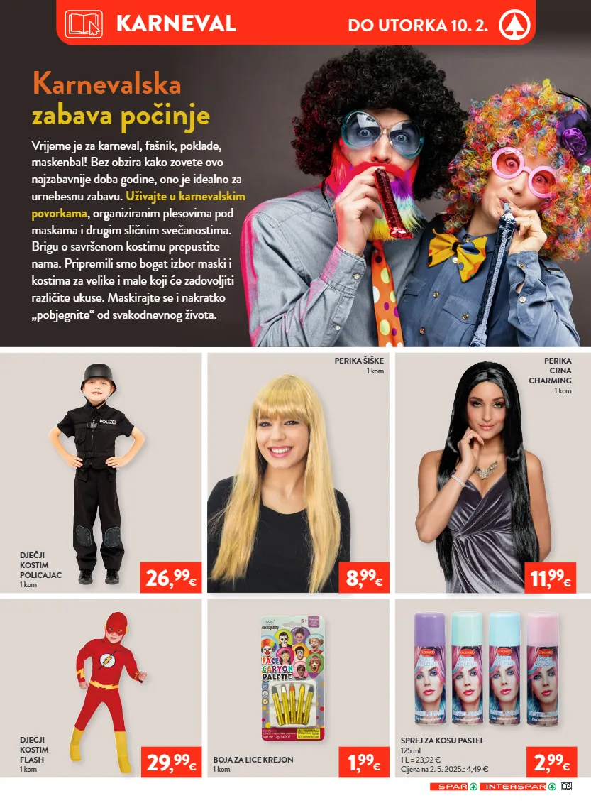 DJEČJI KOSTIM POLICAJAC 1 kom DJEČJI KOSTIM FLASH 1 kom BOJA ZA LICE KREJON 1 kom SPREJ ZA KOSU PASTEL 125 ml 1 L = 23,92 € Cijena na 2. 5. 2025.: 4,49 € PERIKA CRNA CHARMING 1 kom PERIKA ŠIŠKE 1 kom 26 , 99 € 29 , 99 € 8 , 99 € 1 , 99 € 11 , 99 € 2 , 99 € Karnevalska zabava počinje Vrijeme je za karneval, fašnik, poklade, maskenbal! Bez obzira kako zovete ovo najzabavnije doba godine, ono je idealno za urnebesnu zabavu. Uživajte u karnevalskim povorkama , organiziranim plesovima pod maskama i drugim sličnim svečanostima. Brigu o savršenom kostimu prepustite nama. Pripremili smo bogat izbor maski i kostima za velike i male koji će zadovoljiti različite ukuse. Maskirajte se i nakratko „pobjegnite“ od svakodnevnog života. DO UTORKA 10. 2. KARNEVAL