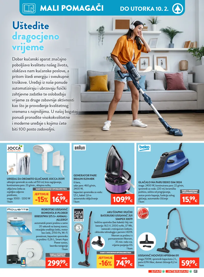 uređaj za okomito glačanje jocca 35591 uklonjivi spremnik za vodu od 150 ml, brzo zagrijavanje, kontinuirana para: 23 g/min., sklopiva ručka, uključena četka za osjetljive odjevne predmete, snaga: 1000 - 1200 w 1 kom glačalo na paru beko sim 3024 snaga: 2400 w, kontinuirana para: 22 g/min, spremnik za vodu: 220 ml, keramička podnica, zaštita od pregrijavanja, sustav protiv kapanja, funkcija suhog glačanja, automatsko čišćenje 1 kom generator pare braun is2144bk 6 bara, udar pare: 460 g/min, 2400 w, kapacitet spremnika za vodu: 1,5 l, kabel: 1,8 m automatsko isključivanje 1 kom aku štapni i ručni baterijski usisavač 2u1 simpex 33079 bežična upotreba (bez kabela)-litij-ion baterija: 18,5 v, 2000 mah, 37 wh, nastavak s rotirajućom četkom, ciklonska tehnologija s perivim hepa filterom za prašinu i s permanentnim filterom, 35 min. rada cca, vrijeme punjenja 4 h 1 kom usisavač hoover hp110hm 011 snaga:700w, spremnik kapaciteta 2 l, perivi epa filter, domet čišćenja 8,2 m 1 kom 109 , 99 € 59 , 99 € uštedite dragocjeno vrijeme dobar kućanski aparat značajno poboljšava kvalitetu našeg života, olakšava nam kućanske poslove, a pritom štedi energiju i sveukupne troškove. uređaji iz naše ponude automatiziraju i ubrzavaju fizički zahtjevne zadatke te oslobađaju vrijeme za druge zabavnije aktivnosti kao što je provođenje kvalitetnog vremena s najmilijima. u našoj bogatoj ponudi pronađite visokokvalitetne i moderne uređaje s kojima ćete biti 100 posto zadovoljni. samo u interspar hipermarketima 15 , 99 € samo u interspar hipermarketima jeftinije -15 % 19,99 16 , 99 € samo u interspar hipermarketima jeftinije -16 % 89,99 74 , 99 € samo u interspar hipermarketima 299 , 99 € robotski usisavač rowenta x-plorer rr8597wh s75 s+ animal- allergy automatski prazni prašinu u samo 20 sekundi na baznoj stanici, rotacijska središnja četka, motor bez četki, 2700 pa, wi-fi povezivost, kapacitet spremnika za prašinu: 0,26 l, smart aqua power sustav, laserska navigacija 1 kom do utorka 10. 2. mali pomagači