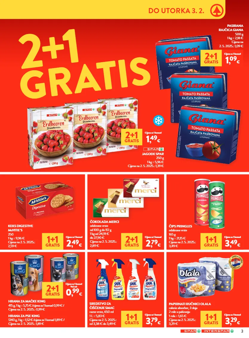 3 2+1 gratis keks digestive mcvitie´s 250 1 kg = 9,96 € cijena na 2. 5. 2025.: 2,59 € 1+1 gratis cijena za 1 komad 2 , 49 € hrana za mačke king 415 g, 1 kg = 5,75 € / cijena za 1 komad 0,99 € / cijena na 2. 5. 2025.: 0,99 € hrana za pse king 1240 g, 1 kg = 1,52 € /cijena za 1 komad 1,89 € / cijena na 2. 5. 2025.: 1,89 € čokolada merci odabrane vrste od 100 g do 112 g 1 kg od 24,91 € do 27,90 € cijena na 2. 5. 2025.: 2,89 € 2+1 gratis cijena za 1 komad 2 , 79 € sredstvo za čišćenje smac razne vrste, 650 ml 1 l = 5,83 € cijena na 2. 5. 2025.: od 3,38 € do 3,49 € 1+1 gratis cijena za 1 komad 3 , 79 € čips pringles odabrane vrste 165 g 1 kg = 21,15 € cijena na 2. 5. 2025.: 3,49 € 1+1 gratis cijena za 1 komad 3 , 49 € papirnati ručnici olala calorie absorber, 3 sloja 2 role u pakiranju 1 rola = 1,65 € cijena na 2. 5. 2025.: 3,29 € 1+1 gratis cijena za 1 komad 3 , 29 € jagode spar 250 g 1 kg = 5,96 € cijena na 2. 5. 2025.: 1,39 € 2+1 gratis cijena za 1 komad 1 , 49 € pasirana rajčica giana 500 g 1 kg = 2,18 € cijena na 2. 5. 2025.: 1,09 € 2+1 gratis cijena za 1 komad 1 , 09 € 2+1 gratis 0 , 99 € cijena za 1 komad već od: do utorka 3. 2.