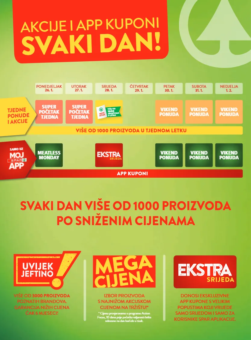 APP KUPONI SUPER POČETAK TJEDNA SUPER POČETAK TJEDNA VIŠE OD 1000 PROIZVODA U LETKU NOVI LETAK VIKEND PONUDA VIKEND PONUDA VIKEND PONUDA PONEDJELJAK 26. 1. UTORAK 27. 1. SRIJEDA 28. 1. ČETVRTAK 29. 1. PETAK 30. 1. SUBOTA 31. 1. NEDJELJA 1. 2. VIŠE OD 1000 PROIZVODA U TJEDNOM LETKU VIŠE OD 3000 PROIZVODA POZNATIH BRANDOVA. GARANCIJA NIŽIH CIJENA ČAK 6 MJESECI! VIKEND PONUDA VIKEND PONUDA VIKEND PONUDA MEATLESS MONDAY TJEDNE PONUDE I AKCIJE SAMO UZ AKCIJE I APP KUPONI SVAKI DAN! SVAKI DAN VIŠE OD 1000 PROIZVODA PO SNIŽENIM CIJENAMA IZBOR PROIZVODA S NAJNIŽOM AKCIJSKOM CIJENOM NA TRŽIŠTU!* MEGA CIJENA * Cijenu provjeravamo u programu Action Focus, 10 dana prije početka valjanosti letka odnosno na dan kad ide u tisak. DONOSI EKSKLUZIVNE APP KUPONE S VELIKIM POPUSTIMA KOJI VRIJEDE SAMO SRIJEDOM I SAMO ZA KORISNIKE SPAR APLIKACIJE.