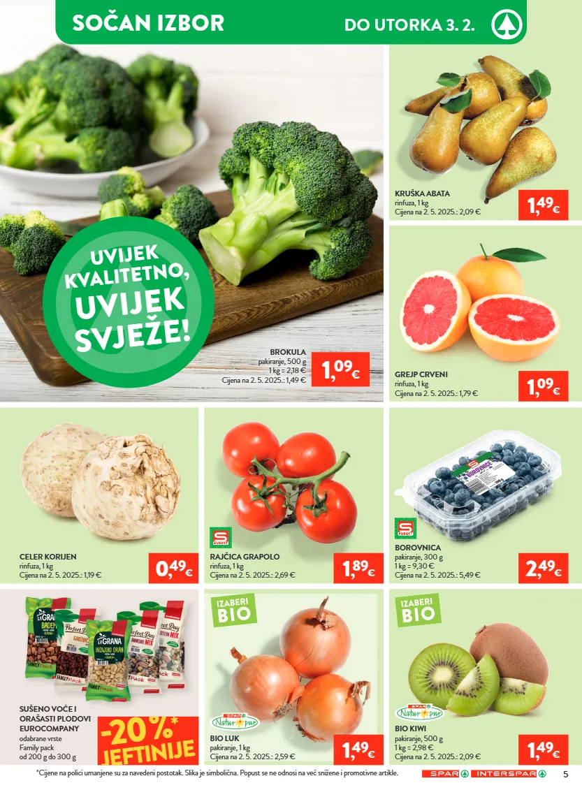 uvijek kvalitetno, uvijek svježe ! sočan izbor do utorka 3. 2. 5 brokula pakiranje, 500 g 1 kg = 2,18 € cijena na 2. 5. 2025.: 1,49 € 1 , 09 € celer korijen rinfuza, 1 kg cijena na 2. 5. 2025.: 1,19 € 0 , 49 € rajčica grapolo rinfuza, 1 kg cijena na 2. 5. 2025.: 2,69 € 1 , 89 € bio luk pakiranje, 1 kg cijena na 2. 5. 2025.: 2,59 € 1 , 49 € borovnica pakiranje, 300 g 1 kg = 9,30 € cijena na 2. 5. 2025.: 5,49 € 2 , 49 € bio kiwi pakiranje, 500 g 1 kg = 2,98 € cijena na 2. 5. 2025.: 2,09 € 1 , 49 € grejp crveni rinfuza, 1 kg cijena na 2. 5. 2025.: 1,79 € 1 , 09 € kruška abata rinfuza, 1 kg cijena na 2. 5. 2025.: 2,09 € 1 , 49 € sušeno voće i orašasti plodovi eurocompany odabrane vrste family pack od 200 g do 300 g -20 % * jeftinije *cijene na polici umanjene su za navedeni postotak. slika je simbolična. popust se ne odnosi na već snižene i promotivne artikle.