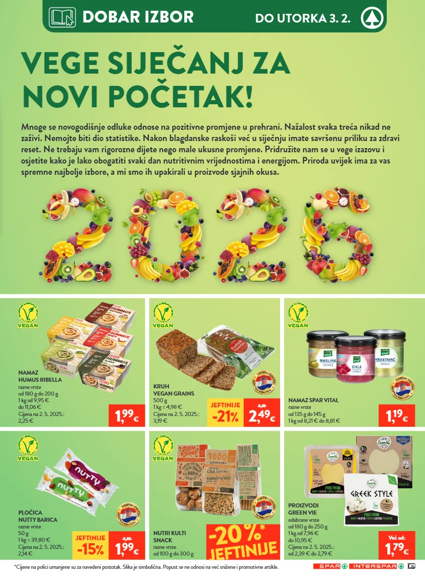 *cijene na polici umanjene su za navedeni postotak. slika je simbolična. popust se ne odnosi na već snižene i promotivne artikle. proizvodi green vie odabrane vrste od 180 g do 250 g 1 kg od 7,96 € do 10,95 € cijena na 2. 5. 2025.: od 2,39 € do 2,79 € nutri kulti snack razne vrste od 100 g do 300 g pločica nutty barica razne vrste 50 g 1 kg = 39,80 € cijena na 2. 5. 2025.: 2,14 € namaz humus ribella razne vrste od 180 g do 200 g 1 kg od 9,95 € do 11,06 € cijena na 2. 5. 2025.: 2,25 € kruh vegan grains 500 g 1 kg = 4,98 € cijena na 2. 5. 2025.: 3,19 € namaz spar vital razne vrste od 135 g do 145 g 1 kg od 8,21 € do 8,81 € mnoge se novogodišnje odluke odnose na pozitivne promjene u prehrani. nažalost svaka treća nikad ne zaživi. nemojte biti dio statistike. nakon blagdanske raskoši već u siječnju imate savršenu priliku za zdravi reset. ne trebaju vam rigorozne dijete nego male ukusne promjene. pridružite nam se u vege izazovu i osjetite kako je lako obogatiti svaki dan nutritivnim vrijednostima i energijom. priroda uvijek ima za vas spremne najbolje izbore, a mi smo ih upakirali u proizvode sjajnih okusa. vege siječanj za novi početak! jeftinije -15 % 2,35 1 , 99 € jeftinije -21 % 3,19 2 , 49 € -20 % * jeftinije već od: 1 , 79 € 1 , 99 € 1 , 19 € do utorka 3. 2. dobar izbor