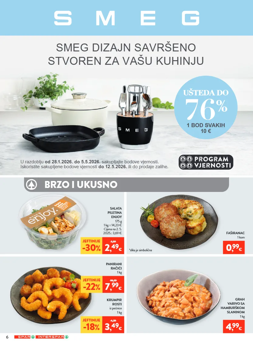 6 grah varivo sa hamburškom slaninom 1 kg jeftinije -22 % 10,29 7 , 99 € panirani račići 1 kg jeftinije -30 % 3,59 2 , 49 € salata piletina enjoy 175 g 1 kg = 14,23 € cijena na 2. 5. 2025.: 3,69 € jeftinije -18 % 4,29 3 , 49 € krumpir rosti iz pećnice 1 kg faširanac 1 kom 0 , 99 € 4 , 99 € u razdoblju od 28.1.2026. do 5.5.2026. sakupljajte bodove vjernosti. iskoristite sakupljene bodove vjernosti do 12.5.2026. ili do prodaje zalihe. smeg dizajn savršeno stvoren za vašu kuhinju ušteda ušteda do do 76 % % 1 bod svakih 10 € *slika je simbolična brzo i ukusno