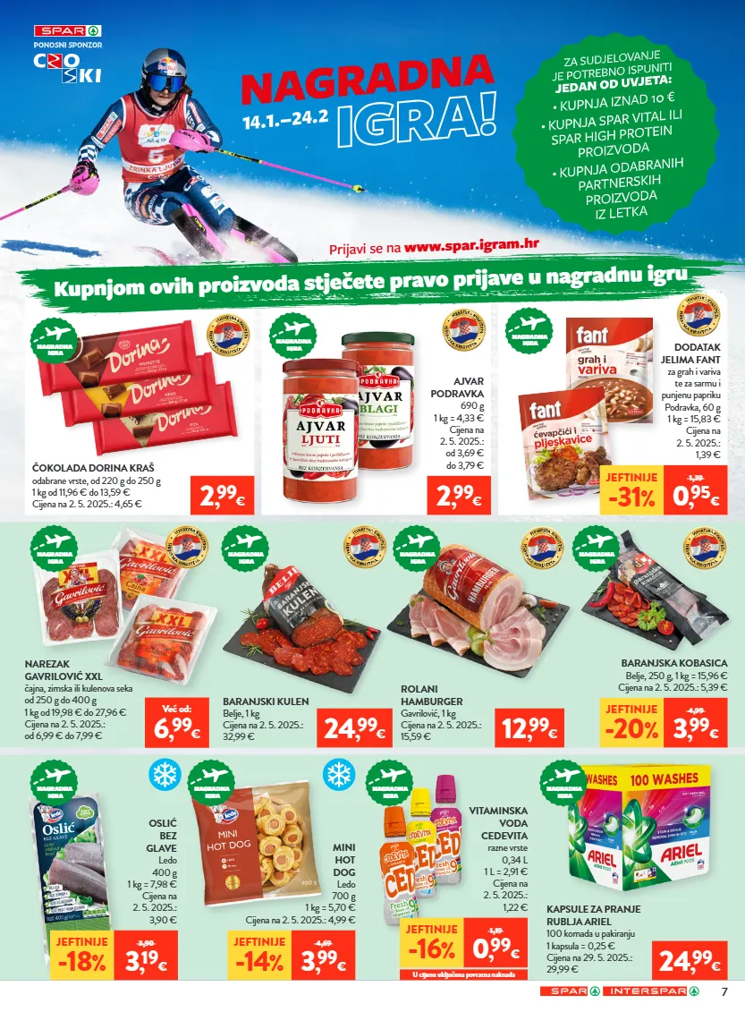 kupnjom ovih proizvoda stječete pravo prijave u nagradnu igru prijavi se na www.spar.igram.hr 7 rolani hamburger gavrilović, 1 kg cijena na 2. 5. 2025.: 15,59 € baranjski kulen belje, 1 kg cijena na 2. 5. 2025.: 32,99 € mini hot dog ledo 700 g 1 kg = 5,70 € cijena na 2. 5. 2025.: 4,99 € oslić bez glave ledo 400 g 1 kg = 7,98 € cijena na 2. 5. 2025.: 3,90 € jeftinije -14 % 4,69 3 , 99 € jeftinije -18 % 3,90 3 , 19 € jeftinije -31 % 1,39 0 , 95 € baranjska kobasica belje, 250 g, 1 kg = 15,96 € cijena na 2. 5. 2025.: 5,39 € jeftinije -20 % 4,99 3 , 99 € dodatak jelima fant za grah i variva te za sarmu i punjenu papriku podravka, 60 g 1 kg = 15,83 € cijena na 2. 5. 2025.: 1,39 € ajvar podravka 690 g 1 kg = 4,33 € cijena na 2. 5. 2025.: od 3,69 € do 3,79 € vitaminska voda cedevita razne vrste 0,34 l 1 l = 2,91 € cijena na 2. 5. 2025.: 1,22 € čokolada dorina kraš odabrane vrste, od 220 g do 250 g 1 kg od 11,96 € do 13,59 € cijena na 2. 5. 2025.: 4,65 € narezak gavrilović xxl čajna, zimska ili kulenova seka od 250 g do 400 g 1 kg od 19,98 € do 27,96 € cijena na 2. 5. 2025.: od 6,99 € do 7,99 € već od: 6 , 99 € kapsule za pranje rublja ariel 100 komada u pakiranju 1 kapsula = 0,25 € cijena na 29. 5. 2025.: 29,99 € jeftinije -16 % 1,19 0 , 99 € u cijenu uključena povratna naknada 2 , 99 € 2 , 99 € 12 , 99 € 24 , 99 € 24 , 99 € nagradna igra nagradna igra nagradna igra nagradna igra nagradna igra nagradna igra nagradna igra nagradna igra nagradna igra nagradna igra nagradna igra