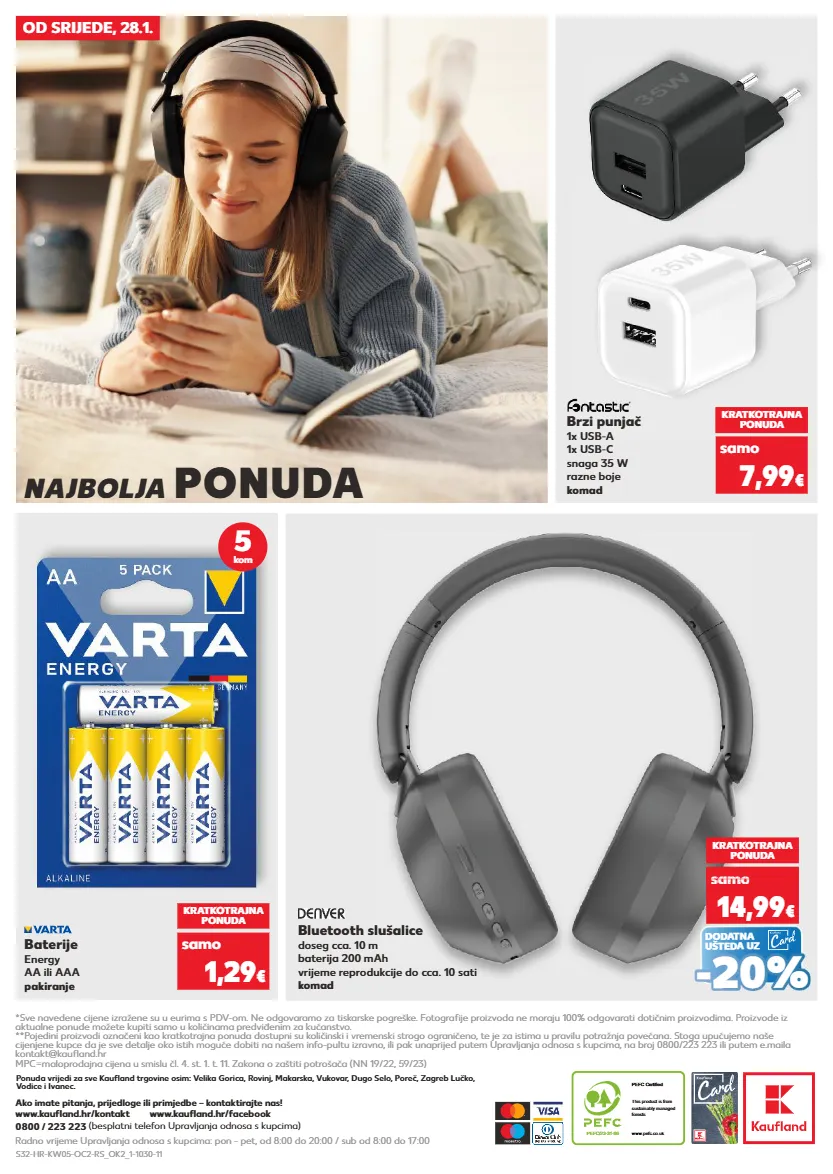 *sve navedene cijene izražene su u eurima s pdv-om. ne odgovaramo za tiskarske pogreške. fotografije proizvoda ne moraju 100% odgovarati dotičnim proizvodima. proizvode iz aktualne ponude možete kupiti samo u količinama predviđenim za kućanstvo. **pojedini proizvodi označeni kao kratkotrajna ponuda dostupni su količinski i vremenski strogo ograničeno, te je za istima u pravilu potražnja povećana. stoga upućujemo naše cijenjene kupce da je sve detalje oko istih moguće dobiti na našem info-pultu izravno, ili pak unaprijed putem upravljanja odnosa s kupcima, na broj 0800/223 223 ili putem e.maila kontakt@kaufland.hr mpc=maloprodajna cijena u smislu čl. 4. st. 1. t. 11. zakona o zaštiti potrošača (nn 19/22, 59/23) pefc/23-31-86 pefc certified this product is from sustainably managed forests www.pefc.co.uk 0800 / 223 223 (besplatni telefon upravljanja odnosa s kupcima) radno vrijeme upravljanja odnosa s kupcima: pon - pet, od 8:00 do 20:00 / sub od 8:00 do 17:00 ako imate pitanja, prijedloge ili primjedbe – kontaktirajte nas! www.kaufland.hr/kontakt www.kaufland.hr/facebook ponuda vrijedi za sve kaufl and trgovine osim: velika gorica, rovinj, makarska, vukovar, dugo selo, poreč, zagreb lučko, vodice i ivanec. od srijede, 28.1. brzi punjač 1x usb-a 1x usb-c snaga 35 w razne boje komad baterije energy aa ili aaa pakiranje kratkotrajna ponuda kratkotrajna ponuda samo samo 7,99 € 1,29 € najbolja ponuda 5 kom dodatna ušteda uz bluetooth slušalice doseg cca. 10 m baterija 200 mah vrijeme reprodukcije do cca. 10 sati komad kratkotrajna ponuda samo 14,99 € sa 14,99 samo 14,99 samo 14,99 samo 14,99 samo samo € - - 20 % 20 % s32-hr-kw05-oc2-rs_ok2_1-1030-11