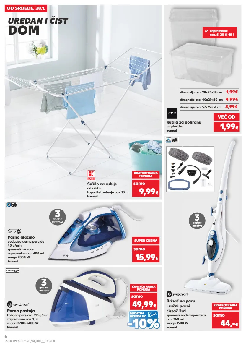 samo od srijede, 28.1. sušilo za rublje od čelika kapacitet sušenja cca. 18 m komad kratkotrajna ponuda samo 9,99 € komad parno glačalo podesiva trajna para do 40 g/min spremnik za vodu zapremnine cca. 400 ml snaga 2800 w komad super cijena 15,99 € samo brisač na paru i ručni parni čistač 2u1 spremnik vode kapaciteta cca. 350 ml snaga 1500 w komad kratkotrajna ponuda samo 44,- € uredan i čist dom već od 1,99 € kutija za pohranu od plastike komad ✓ zapremnine cca. 5, 20 ili 45 l 3 3 3 dimenzije cca. 29x20x18 cm 1,99€ dimenzije cca. 40x29x30 cm 4,99€ dimenzije cca. 57x39x31 cm 8,99€ kratkotrajna ponuda samo 49,99 € dodatna ušteda uz - - 10% 10% parna postaja količina pare cca. 115 g/min zapremnine cca. 1,8 l snaga 2200-2400 w komad 3 s6-hr-kw05-oc2-nf_sri_uto_1_l-1030-11 6