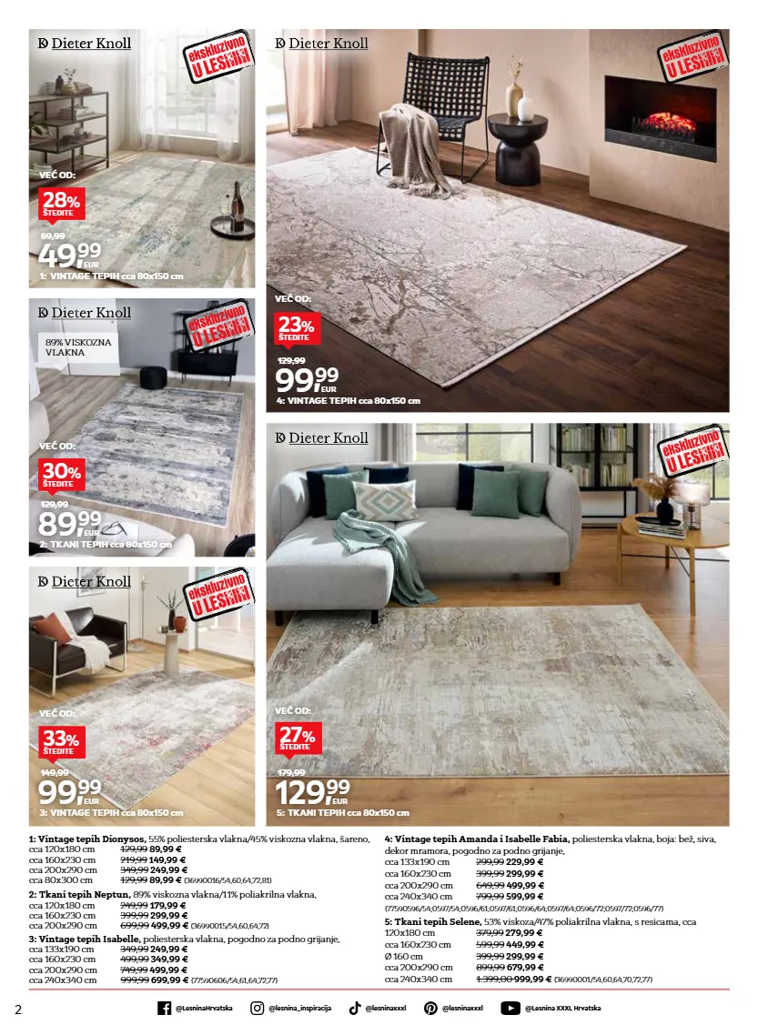 2 @lesnina xxxl hrvatska @lesninahrvatska @lesninaxxxl @lesninaxxxl @lesnina_inspiracija 4: vintage tepih amanda i isabelle fabia, poliesterska vlakna, boja: bež, siva, dekor mramora, pogodno za podno grijanje, cca 133x190 cm 299,99 229,99 € cca 160x230 cm 399,99 299,99 € cca 200x290 cm 649,99 499,99 € cca 240x340 cm 799,99 599,99 € (77590596/54;0597/54;0596/61;0597/61;0596/64;0597/64;0596/72;0597/72;0596/77) 99, 99 eur 129,99 4: vintage tepih cca 80x150 cm 23 % štedite 5: tkani tepih selene, 53% viskoza/47% poliakrilna vlakna, s resicama, cca 120x180 cm 379,99 279,99 € cca 160x230 cm 599,99 449,99 € ø 160 cm 399,99 299,99 € cca 200x290 cm 899,99 679,99 € cca 240x340 cm 1.399,00 999,99 € (36990001/54,60,64,70,72,77) 129, 99 eur 179,99 5: tkani tepih cca 80x150 cm 27 % štedite 1: vintage tepih dionysos, 55% poliesterska vlakna/45% viskozna vlakna, šareno, cca 120x180 cm 129,99 89,99 € cca 160x230 cm 219,99 149,99 € cca 200x290 cm 349,99 249,99 € cca 80x300 cm 129,99 89,99 € (36990016/54,60,64,72,81) 49, 99 eur 69,99 1: vintage tepih cca 80x150 cm 28 % štedite 2: tkani tepih neptun, 89% viskozna vlakna/11% poliakrilna vlakna, cca 120x180 cm 249,99 179,99 € cca 160x230 cm 399,99 299,99 € cca 200x290 cm 699,99 499,99 € (36990015/54,60,64,72) 89, 99 eur 129,99 2: tkani tepih cca 80x150 cm 30 % štedite 3: vintage tepih isabelle, poliesterska vlakna, pogodno za podno grijanje, cca 133x190 cm 349,99 249,99 € cca 160x230 cm 499,99 349,99 € cca 200x290 cm 749,99 499,99 € cca 240x340 cm 999,99 699,99 € (77590606/54,61,64,72,77) 99, 99 eur 149,99 3: vintage tepih cca 80x150 cm 33 % štedite 89% viskozna vlakna već od: već od: već od: već od: već od: