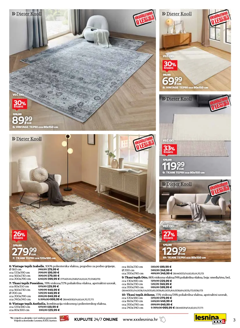 3 kupujte 24/7 online www.xxxlesnina.hr *ne vrijedi za akcijske i već snižene proizvode. vrijedi za korisnike lesnina xxxl kartice. www.xxxlesnina.hr lesnina xxxl card 6: vintage tepih isabelle , 100% poliesterska vlakna, pogodno za podno grijanje, ø 160 cm 249,99 179,99 € cca 133x190 cm 299,99 199,99 € cca 160x230 cm 399,99 279,99 € cca 200x290 cm 649,99 399,99 € (77590544;0580/54,61,64,72;0580/70) 89, 99 eur 129,99 6: vintage tepih cca 80x150 cm 30 % štedite 7: tkani tepih poseidon, 78% viskoza/22% poliakrilna vlakna, apstraktni uzorak, cca 80x150 cm 179,99 129,99 € cca 160x230 cm 599,99 449,99 € ø 200 cm 599,99 449,99 € cca 200x290 cm 899,99 649,99 € cca 240x340 cm 1.399,00 999,99 € (36990010/54,60,64,70,72,77) 279, 99 eur 379,99 7: tkani tepih cca 120x180 cm 26 % štedite 8: vintage tepih anthelia, kombinacija viskoznog i poliesterskog vlakna, cca 120x180 cm 179,99 119,99 € cca 80x300 cm 199,99 129,99 € 69, 99 eur 99,99 8: vintage tepih cca 80x150 cm 30 % štedite 9: tkani tepih otto, 86% viskozna vlakna/14% poliakrilna vlakna, boja: smeđa/siva, bež, cca 130x190 cm 329,99 229,99 € cca 160x230 cm 519,99 349,99 € cca 200x290 cm 919,99 599,99 € (36990035/54;0036/54;0035/61;0036/61;0035/64;0036/64;0035/72;0036/72) 119, 99 eur 179,99 9: tkani tepih cca 80x150 cm 33 % štedite 10: tkani tepih athene, 72% viskoza/28% poliakrilna vlakna, apstraktni uzorak, cca 120x180 cm 379,99 279,99 € cca 160x230 cm 599,99 449,99 € cca 200x290 cm 899,99 649,99 € cca 240x340 cm 1.399,00 999,99 € (36990019/54,60,64,72,77) 129, 99 eur 179,99 10: tkani tepih cca 80x150 cm 27 % štedite cca 160x230 cm 319,99 199,99 € ø 200 cm 349,99 249,99 € cca 200x290 cm 499,99 349,99 € (36990023/54,60,81,64,70,72) već od: već od: već od: već od: