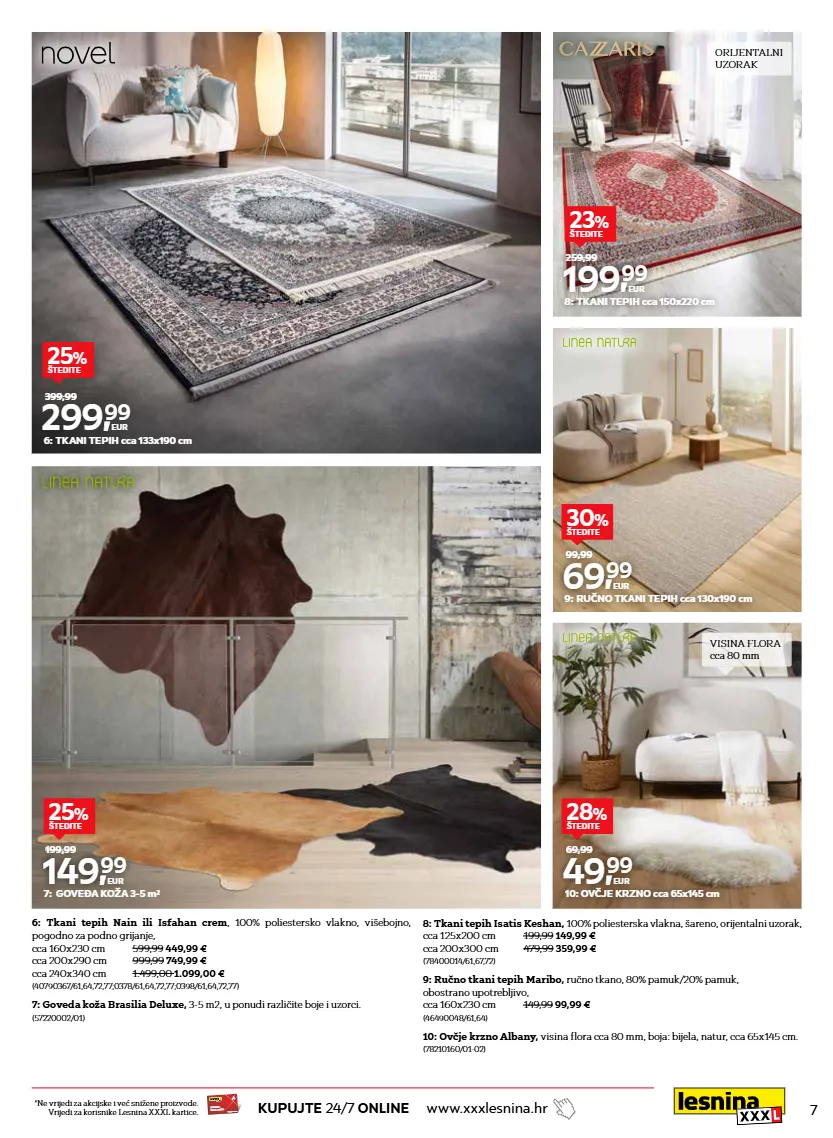 7 kupujte 24/7 online www.xxxlesnina.hr *ne vrijedi za akcijske i već snižene proizvode. vrijedi za korisnike lesnina xxxl kartice. www.xxxlesnina.hr lesnina xxxl card 7: goveđa koža brasilia deluxe, 3-5 m2, u ponudi različite boje i uzorci. (57220002/01) 149, 99 eur 199,99 7: goveđa koža 3-5 m 2 25 % štedite 6: tkani tepih nain ili isfahan crem , 100% poliestersko vlakno, višebojno, pogodno za podno grijanje, cca 160x230 cm 599,99 449,99 € cca 200x290 cm 999,99 749,99 € cca 240x340 cm 1.499,00 1.099,00 € (40790367/61,64,72,77;0378/61,64,72,77;0398/61,64,72,77) 299, 99 eur 399,99 6: tkani tepih cca 133x190 cm 25 % štedite 8: tkani tepih isatis keshan, 100% poliesterska vlakna, šareno, orijentalni uzorak, cca 125x200 cm 199,99 149,99 € cca 200x300 cm 479,99 359,99 € (78400014/61,67,72) 199, 99 eur 259,99 8: tkani tepih cca 150x220 cm 23 % štedite 9: ručno tkani tepih maribo, ručno tkano, 80% pamuk/20% pamuk, obostrano upotrebljivo, cca 160x230 cm 149,99 99,99 € (46490048/61,64) 69, 99 eur 99,99 9: ručno tkani tepih cca 130x190 cm 30 % štedite 10: ovčje krzno albany, visina flora cca 80 mm, boja: bijela, natur, cca 65x145 cm. (78210160/01-02) 49, 99 eur 69,99 10: ovčje krzno cca 65x145 cm 28 % štedite orijentalni uzorak visina flora cca 80 mm
