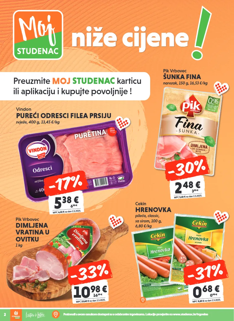 preuzmite moj studenac karticu ili aplikaciju i kupujte povoljnije ! 2 proizvodi s ovom oznakom dostupni su u odabranim trgovinama. lokacije provjerite na www.studenac.hr/trgovine niže cijene pik vrbovec šunka fina narezak, 150 g, 16,53 €/kg 2 , 48 € mpc 3,43 € na dan 2.5.2025. 3, 55 € -30% pik vrbovec dimljena vratina u ovitku 1 kg 10 , 98 € mpc 15,60 € na dan 2.5.2025. 16, 39 € -33% cekin hrenovka pileća, classic, sa sirom, 100 g, 6,80 €/kg 0 , 68 € mpc 0,85 € na dan 2.5.2025. 0, 99 € -31% vindon pureći odresci filea prsiju svježe, 400 g, 13,45 €/kg 5 , 38 € mpc 6,55 € na dan 2.5.2025. 6, 55 € -17%