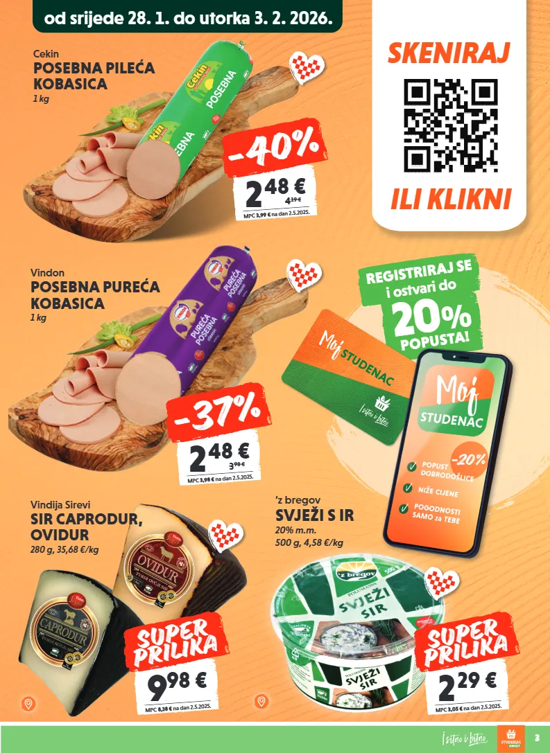 skeniraj ili klikni 3 registriraj se i ostvari do 20 % popusta! cekin posebna pileća kobasica 1 kg 2 , 48 € mpc 3,99 € na dan 2.5.2025. 4, 19 € -40% vindon posebna pureća kobasica 1 kg 2 , 48 € mpc 3,98 € na dan 2.5.2025. 3, 98 € -37% ‘z bregov svježi s ir 20% m.m. 500 g, 4,58 €/kg 2 , 29 € mpc 3,05 € na dan 2.5.2025. super prilika od srijede 28. 1. do utorka 3. 2. 2026. 9 , 98 € mpc 8,38 € na dan 2.5.2025. super prilika vindija sirevi sir caprodur, ovidur 280 g, 35,68 €/kg