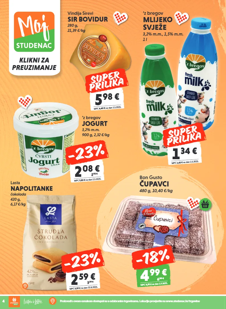 4 proizvodi s ovom oznakom dostupni su u odabranim trgovinama. lokacije provjerite na www.studenac.hr/trgovine klikni za preuzimanje bon gusto čupavci 480 g, 10,40 €/kg lasta napolitanke čokolada 420 g, 6,17 €/kg ‘z bregov mlijeko svježe 3,2% m.m., 1,5% m.m. 1 l 1 , 34 € mpc 1,62 € na dan 2.5.2025. super prilika ‘z bregov jogurt 3,2% m.m. 900 g, 2,32 €/kg 2 , 59 € mpc 3,39 € na dan 22.8.2025. 3, 39 € -23% 2 , 08 € mpc 2,85 € na dan 2.5.2025. 2, 92 € -23% vindija sirevi sir bovidur 280 g, 21,39 €/kg 5 , 98 € mpc 6,49 € na dan 2.5.2025. super prilika 4 , 99 € mpc 5,79 € na dan 2.5.2025. 6, 09 € -18%