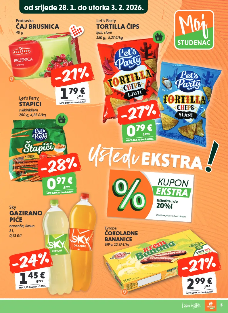 5 uštedi ekstra let’s party štapići s kikirikijem 200 g, 4,85 €/kg 0 97 € mpc 1,23 € na dan 2.5.2025. 1 35 € -28% 0 79 € mpc 1,01 € na dan 2.5.2025. 1 09 € -27% podravka čaj brusnica 40 g 1 , 79 € mpc 2,03 € na dan 2.5.2025. 2, 29 € -21% let’s party tortilla čips ljuti, slani 150 g, 5,27 €/kg 2 , 99 € mpc 1,59 € na dan 2.5.2025. 3, 79 € -21% evropa čokoladne bananice 289 g, 10,35 €/kg od srijede 28. 1. do utorka 3. 2. 2026. sky gazirano piće naranča, limun 2 l, 0,73 €/l 1 , 45 € mpc 1,83 € na dan 2.5.2025. 1, 92 € -24%