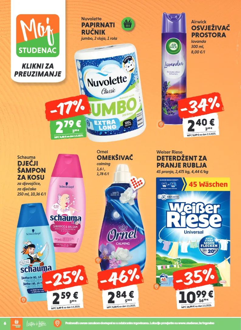 klikni za preuzimanje 6 proizvodi s ovom oznakom dostupni su u odabranim trgovinama. lokacije provjerite na www.studenac.hr/trgovine ornel omekšivač calming 1,6 l , 1,78 €/l nuvolette papirnati ručnik jumbo, 2 sloja, 1 rola weiser riese deterdžent za pranje rublja 45 pranja, 2,475 kg, 4,44 €/kg 10 , 99 € mpc 16,99 € na dan 2.5.2025. 16, 99 € -35% schauma dječji šampon za kosu za djevojčice, za dječake 250 ml, 10,36 €/l 2 , 59 € mpc 3,49 € na dan 2.5.2025. 3, 49 € -25% airwick osvježivač prostora lavanda 300 ml, 8,00 €/l 2 , 40 € mpc 3,69 € na dan 2.5.2025. 3, 69 € -34% 2 , 84 € mpc 5,30 € na dan 2.5.2025. 5, 30 € -46% 2 79 € mpc 3,46 € na dan 2.5.2025. 3 39 € -17%