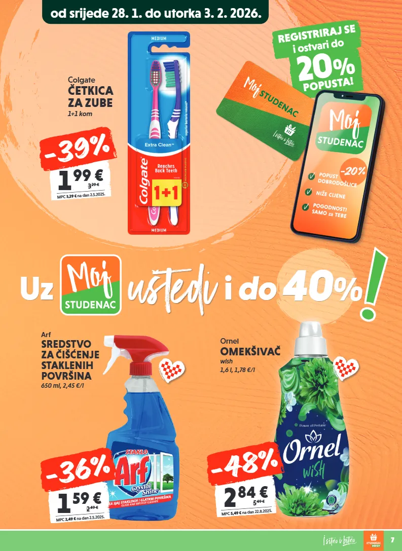 7 Ornel OMEKŠIVAČ wish 1,6 l, 1,78 €/l Colgate ČETKICA ZA ZUBE 1+1 kom REGISTRIRAJ SE i ostvari do 20 % POPUSTA! Arf SREDSTVO ZA ČIŠĆENJE STAKLENIH POVRŠINA 650 ml, 2,45 €/l 1 , 59 € MPC 2,49 € na dan 2.5.2025. 2, 49 € -36% 2 , 84 € MPC 5,49 € na dan 22.8.2025. 5, 49 € -48% 1 , 99 € MPC 3,29 € na dan 2.5.2025. 3, 29 € -39% od srijede 28. 1. do utorka 3. 2. 2026. Uz i do 40 % uštedi