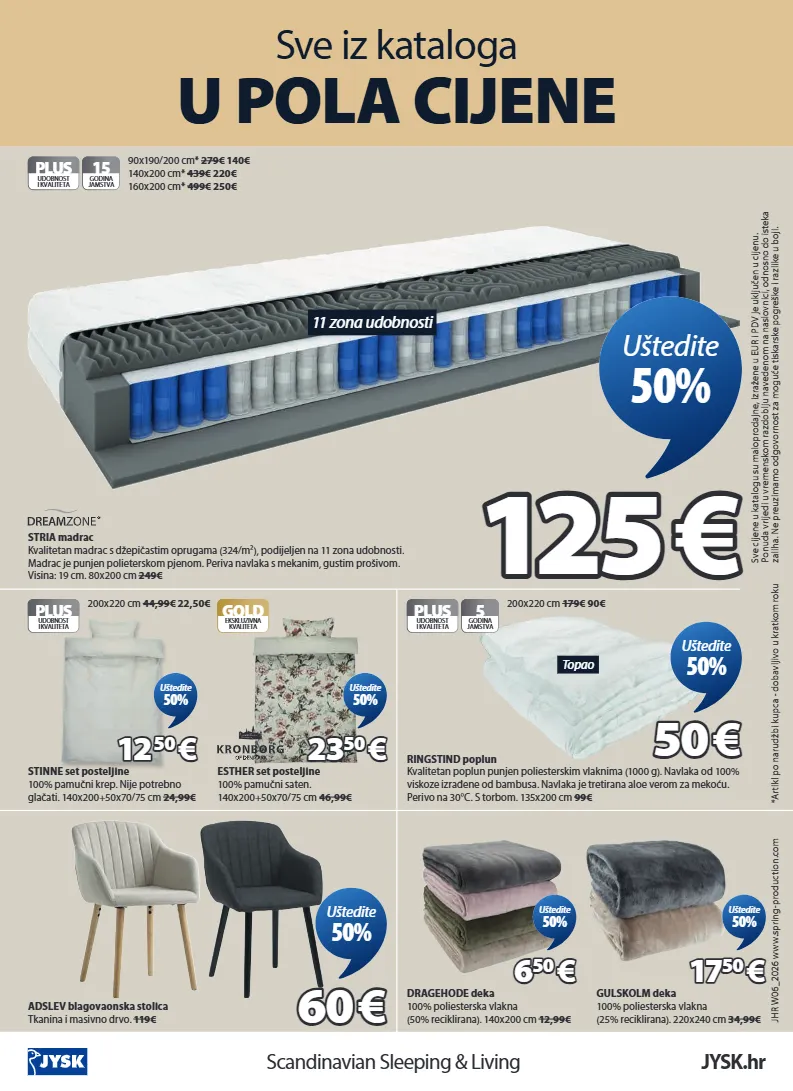 scandinavian sleeping & living jysk.hr sve iz kataloga u pola cijene *artikl po narudžbi kupca - dobavljivo u kratkom roku sve cijene u katalogu su maloprodajne, izražene u eur i pdv je uključen u cijenu. ponuda vrijedi u vremenskom razdoblju navedenom na naslovnici, odnosno do isteka zaliha. ne preuzimamo odgovornost za moguće tiskarske pogreške i razlike u boji. dragehode deka 100% poliesterska vlakna (50% reciklirana). 140x200 cm 12,99€ 6 6 50 50 € € uštedite 50% gulskolm deka 100% poliesterska vlakna (25% reciklirana). 220x240 cm 34,99€ 17 17 50 50 € € uštedite 50% adslev blagovaonska stolica tkanina i masivno drvo. 119€ 60 60 € € uštedite 50% topao plus udobnost i kvaliteta 5 godina jamstva ringstind poplun kvalitetan poplun punjen poliesterskim vlaknima (1000 g). navlaka od 100% viskoze izrađene od bambusa. navlaka je tretirana aloe verom za mekoću. perivo na 30°c. s torbom. 135x200 cm 99€ 200x220 cm 179€ 90€ 50 50 € € uštedite 50% gold ekskluzivna kvaliteta esther set posteljine 100% pamučni saten. 140x200+50x70/75 cm 46,99€ 23 23 50 50 € € uštedite 50% plus udobnost i kvaliteta stinne set posteljine 100% pamučni krep. nije potrebno glačati. 140x200+50x70/75 cm 24,99€ 200x220 cm 44,99€ 22,50€ 12 12 50 50 € € uštedite 50% 11 zona udobnosti plus udobnost i kvaliteta 15 godina jamstva stria madrac kvalitetan madrac s džepičastim oprugama (324/m²), podijeljen na 11 zona udobnosti. madrac je punjen polieterskom pjenom. periva navlaka s mekanim, gustim prošivom. visina: 19 cm. 80x200 cm 249€ 90x190/200 cm* 279€ 140€ 140x200 cm* 439€ 220€ 160x200 cm* 499€ 250€ 125 125 € € uštedite 50% jhr w06_2026 www.spring-production.com 4544408 4541308 3690517 3690514 4123950 1832680 1845180 3264323