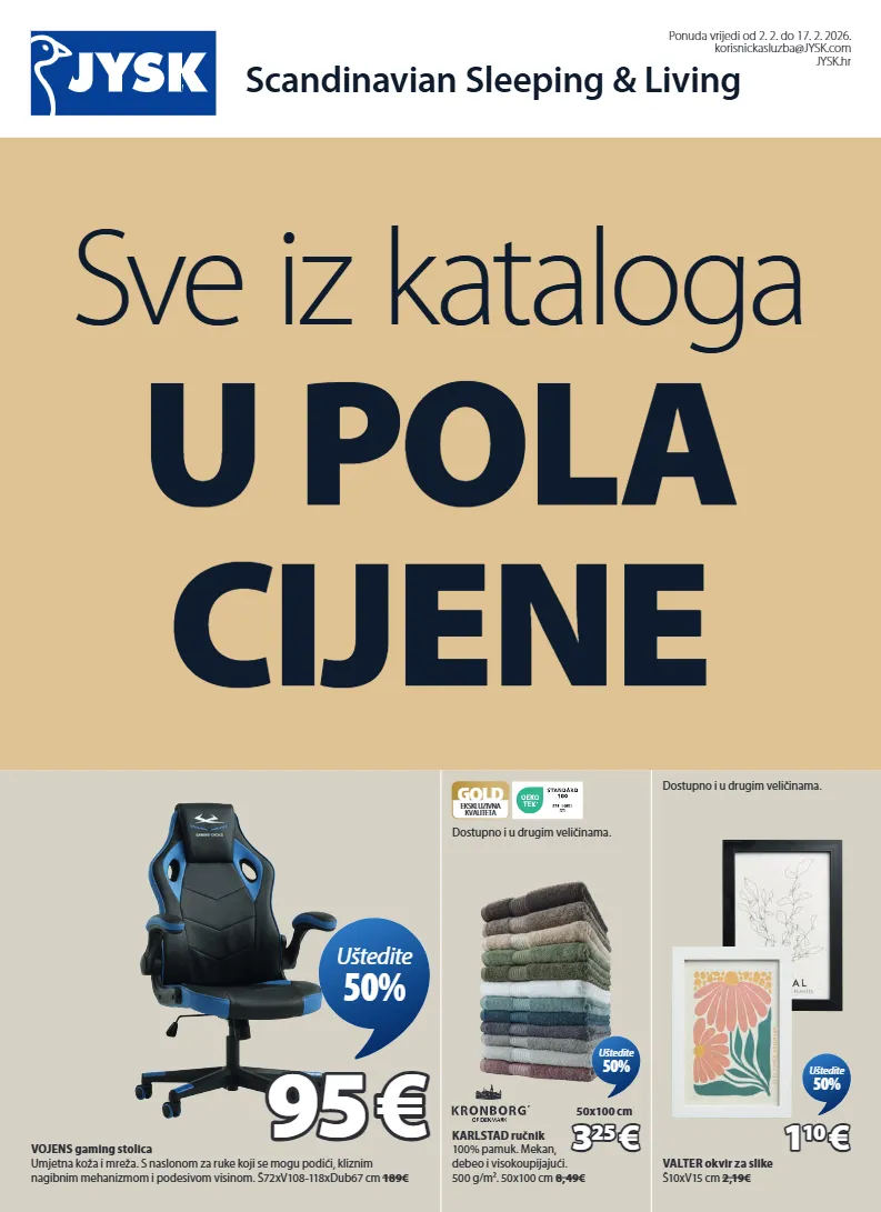 scandinavian sleeping & living ponuda vrijedi od 2. 2. do 17. 2. 2026. korisnickasluzba@jysk.com jysk.hr vojens gaming stolica umjetna koža i mreža. s naslonom za ruke koji se mogu podići, kliznim nagibnim mehanizmom i podesivom visinom. š72xv108-118xdub67 cm 189€ 95 95 € € uštedite 50% karlstad ručnik 100% pamuk. mekan, debeo i visokoupijajući. 500 g/m². 50x100 cm 8,49€ 9 7 6 - 1 4 6 0 1 d t i gold ekskluzivna kvaliteta dostupno i u drugim veličinama. 3 3 25 25 € € 50x100 cm uštedite 50% valter okvir za slike š10xv15 cm 2,19€ dostupno i u drugim veličinama. 1 1 10 10 € € uštedite 50% sve iz kataloga u pola cijene 3690234 2332758 4911957 4912247