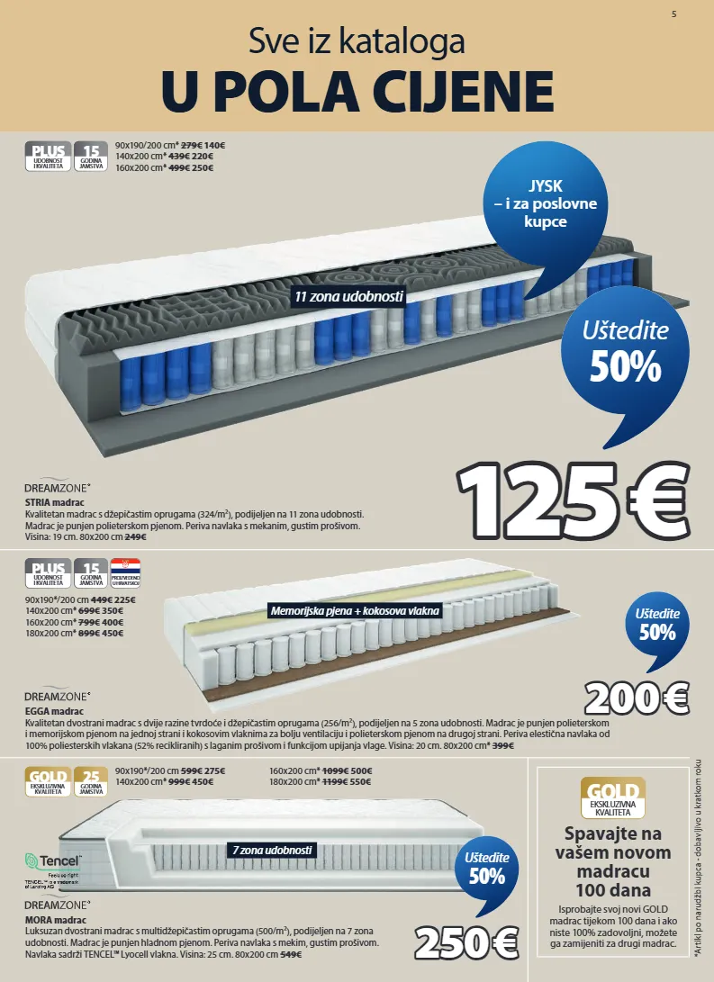5 sve iz kataloga u pola cijene *artikl po narudžbi kupca - dobavljivo u kratkom roku spavajte na vašem novom madracu 100 dana isprobajte svoj novi gold madrac tijekom 100 dana i ako niste 100% zadovoljni, možete ga zamijeniti za drugi madrac. gold ekskluzivna kvaliteta 7 zona udobnosti gold 25 godina jamstva ekskluzivna kvaliteta mora madrac luksuzan dvostrani madrac s multidžepičastim oprugama (500/m²), podijeljen na 7 zona udobnosti. madrac je punjen hladnom pjenom. periva navlaka s mekim, gustim prošivom. navlaka sadrži tencel™ lyocell vlakna. visina: 25 cm. 80x200 cm 549€ 90x190*/200 cm 599€ 275€ 140x200 cm* 999€ 450€ 250 250 € € uštedite 50% 160x200 cm* 1099€ 500€ 180x200 cm* 1199€ 550€ memorijska pjena + kokosova vlakna egga madrac kvalitetan dvostrani madrac s dvije razine tvrdoće i džepičastim oprugama (256/m²), podijeljen na 5 zona udobnosti. madrac je punjen polieterskom i memorijskom pjenom na jednoj strani i kokosovim vlaknima za bolju ventilaciju i polieterskom pjenom na drugoj strani. periva elestična navlaka od 100% poliesterskih vlakana (52% recikliranih) s laganim prošivom i funkcijom upijanja vlage. visina: 20 cm. 80x200 cm* 399€ plus udobnost i kvaliteta 15 godina jamstva proizvedeno u hrvatskoj 90x190*/200 cm 449€ 225€ 140x200 cm* 699€ 350€ 160x200 cm* 799€ 400€ 180x200 cm* 899€ 450€ 200 200 € € uštedite 50% 11 zona udobnosti plus udobnost i kvaliteta 15 godina jamstva stria madrac kvalitetan madrac s džepičastim oprugama (324/m²), podijeljen na 11 zona udobnosti. madrac je punjen polieterskom pjenom. periva navlaka s mekanim, gustim prošivom. visina: 19 cm. 80x200 cm 249€ 90x190/200 cm* 279€ 140€ 140x200 cm* 439€ 220€ 160x200 cm* 499€ 250€ 125 125 € € uštedite 50% jysk – i za poslovne kupce 3398223 3253123 3264323