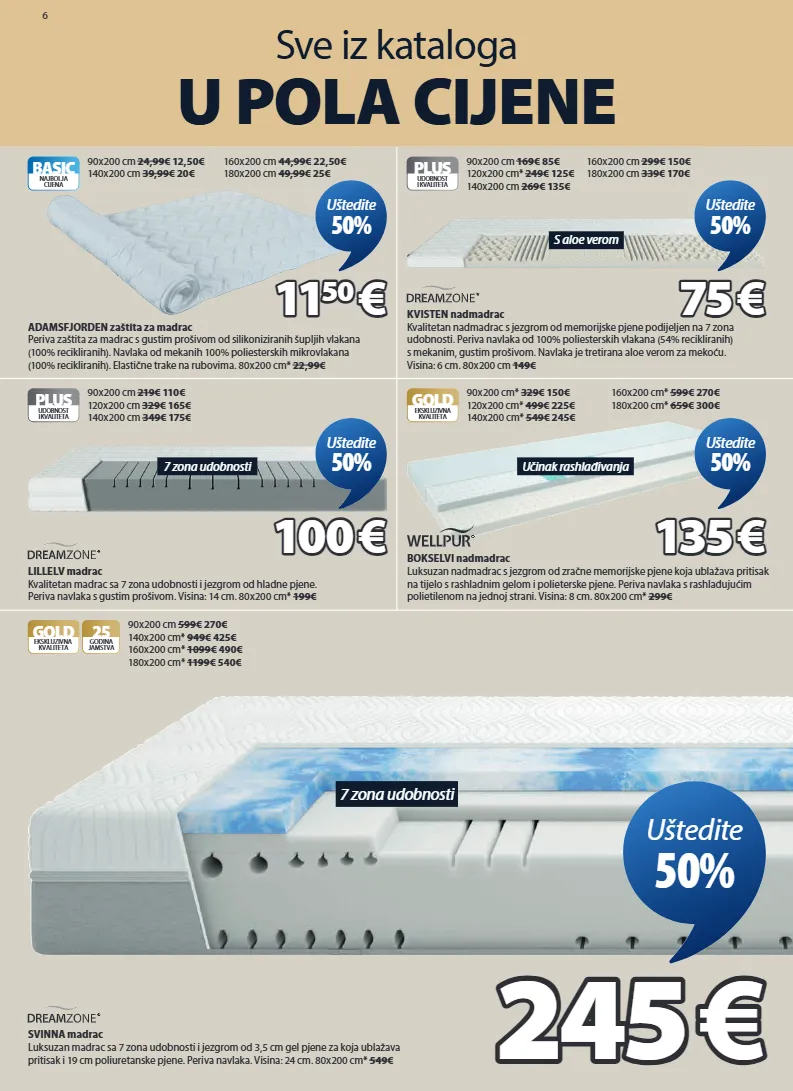 6 sve iz kataloga u pola cijene učinak rashlađivanja gold ekskluzivna kvaliteta bokselvi nadmadrac luksuzan nadmadrac s jezgrom od zračne memorijske pjene koja ublažava pritisak na tijelo s rashladnim gelom i polieterske pjene. periva navlaka s rashlađujućim polietilenom na jednoj strani. visina: 8 cm. 80x200 cm* 299€ 90x200 cm* 329€ 150€ 120x200 cm* 499€ 225€ 140x200 cm* 549€ 245€ 135 135 € € uštedite 50% 7 zona udobnosti plus udobnost i kvaliteta lillelv madrac kvalitetan madrac sa 7 zona udobnosti i jezgrom od hladne pjene. periva navlaka s gustim prošivom. visina: 14 cm. 80x200 cm* 199€ 90x200 cm 219€ 110€ 120x200 cm 329€ 165€ 140x200 cm 349€ 175€ 100 100 € € uštedite 50% s aloe verom plus udobnost i kvaliteta kvisten nadmadrac kvalitetan nadmadrac s jezgrom od memorijske pjene podijeljen na 7 zona udobnosti. periva navlaka od 100% poliesterskih vlakana (54% recikliranih) s mekanim, gustim prošivom. navlaka je tretirana aloe verom za mekoću. visina: 6 cm. 80x200 cm 149€ 90x200 cm 169€ 85€ 120x200 cm* 249€ 125€ 140x200 cm 269€ 135€ 75 75 € € uštedite 50% basic najbolja cijena adamsfjorden zaštita za madrac periva zaštita za madrac s gustim prošivom od silikoniziranih šupljih vlakana (100% recikliranih). navlaka od mekanih 100% poliesterskih mikrovlakana (100% recikliranih). elastične trake na rubovima. 80x200 cm* 22,99€ 90x200 cm 24,99€ 12,50€ 140x200 cm 39,99€ 20€ 11 11 50 50 € € uštedite 50% 160x200 cm* 599€ 270€ 180x200 cm* 659€ 300€ 160x200 cm 299€ 150€ 180x200 cm 339€ 170€ 160x200 cm 44,99€ 22,50€ 180x200 cm 49,99€ 25€ 7 zona udobnosti gold 25 godina jamstva ekskluzivna kvaliteta svinna madrac luksuzan madrac sa 7 zona udobnosti i jezgrom od 3,5 cm gel pjene za koja ublažava pritisak i 19 cm poliuretanske pjene. periva navlaka. visina: 24 cm. 80x200 cm* 549€ 90x200 cm 599€ 270€ 140x200 cm* 949€ 425€ 160x200 cm* 1099€ 490€ 180x200 cm* 1199€ 540€ 245 245 € € uštedite 50% 3441523 3270923 3444423 3447232 3278523