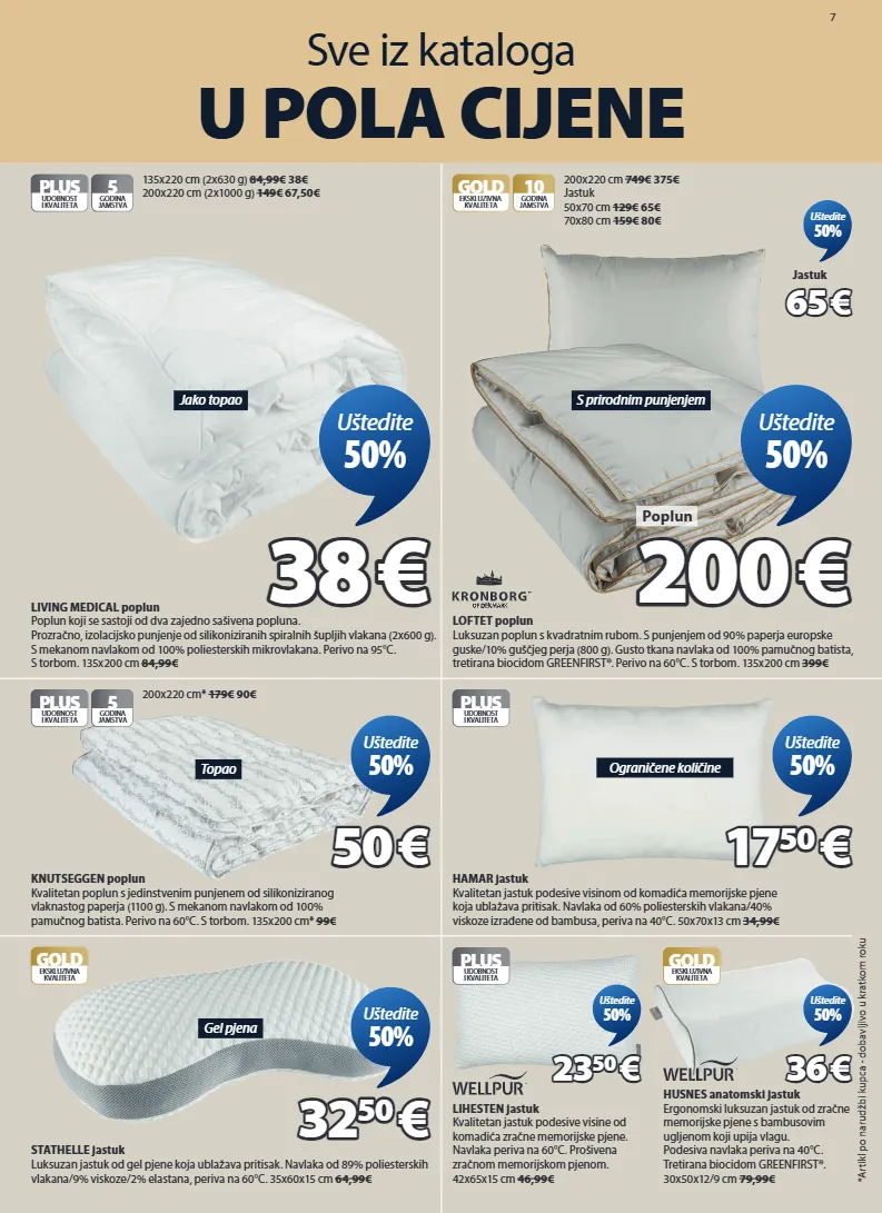 7 sve iz kataloga u pola cijene *artikl po narudžbi kupca - dobavljivo u kratkom roku plus udobnost i kvaliteta lihesten jastuk kvalitetan jastuk podesive visine od komadića zračne memorijske pjene. navlaka periva na 60°c. prošivena zračnom memorijskom pjenom. 42x65x15 cm 46,99€ 23 23 50 50 € € uštedite 50% gold ekskluzivna kvaliteta husnes anatomski jastuk ergonomski luksuzan jastuk od zračne memorijske pjene s bambusovim ugljenom koji upija vlagu. podesiva navlaka periva na 40°c. tretirana biocidom greenfirst®. 30x50x12/9 cm 79,99€ 36 36 € € uštedite 50% topao plus udobnost i kvaliteta 5 godina jamstva knutseggen poplun kvalitetan poplun s jedinstvenim punjenem od silikoniziranog vlaknastog paperja (1100 g). s mekanom navlakom od 100% pamučnog batista. perivo na 60°c. s torbom. 135x200 cm* 99€ 200x220 cm* 179€ 90€ 50 50 € € uštedite 50% ograničene količine plus udobnost i kvaliteta hamar jastuk kvalitetan jastuk podesive visinom od komadića memorijske pjene koja ublažava pritisak. navlaka od 60% poliesterskih vlakana/40% viskoze izrađene od bambusa, periva na 40°c. 50x70x13 cm 34,99€ 17 17 50 50 € € uštedite 50% gel pjena gold ekskluzivna kvaliteta stathelle jastuk luksuzan jastuk od gel pjene koja ublažava pritisak. navlaka od 89% poliesterskih vlakana/9% viskoze/2% elastana, periva na 60°c. 35x60x15 cm 64,99€ 32 32 50 50 € € uštedite 50% s prirodnim punjenjem gold 10 godina jamstva ekskluzivna kvaliteta loftet poplun luksuzan poplun s kvadratnim rubom. s punjenjem od 90% paperja europske guske/10% guščjeg perja (800 g). gusto tkana navlaka od 100% pamučnog batista, tretirana biocidom greenfirst®. perivo na 60°c. s torbom. 135x200 cm 399€ 200x220 cm 749€ 375€ jastuk 50x70 cm 129€ 65€ 70x80 cm 159€ 80€ 200 200 € € poplun uštedite 50% 65 65 € € jastuk uštedite 50% jako topao plus udobnost i kvaliteta 5 godina jamstva living medical poplun poplun koji se sastoji od dva zajedno sašivena popluna. prozračno, izolacijsko punjenje od silikoniziranih spiralnih šupljih vlakana (2x600 g). s mekanom navlakom od 100% poliesterskih mikrovlakana. perivo na 95°c. s torbom. 135x200 cm 84,99€ 135x220 cm (2x630 g) 84,99€ 38€ 200x220 cm (2x1000 g) 149€ 67,50€ 38 38 € € uštedite 50% 4351701 4240300 4131550 4253204 4324900 4026050 4226004 4116050