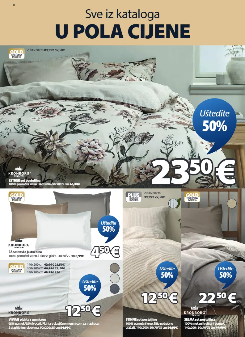 8 sve iz kataloga u pola cijene gold ekskluzivna kvaliteta vivian plahta s gumicom 65% pamuk/35% lyocell. plahta s elastičnom gumicom za madrace. s elastičnim rubovima. 90x200x35 cm 24,99€ 140x200 cm 42,99€ 21,50€ 160x200 cm 44,99€ 22,50€ 180x200 cm 49,99€ 25€ 12 12 50 50 € € uštedite 50% gold ekskluzivna kvaliteta selma set posteljina 100% mekani tretirani pamuk. 140x200+50x70/75 cm 44,99€ 22 22 50 50 € € uštedite 50% plus udobnost i kvaliteta stinne set posteljine 100% pamučni krep. nije potrebno glačati. 140x200+50x70/75 cm 24,99€ 200x220 cm 44,99€ 22,50€ 200x220 cm 84,99€ 42,50€ 12 12 50 50 € € uštedite 50% gold ekskluzivna kvaliteta ea satenska jastučnica 100% pamučni saten. lako se glača. 50x70/75 cm 8,99€ 4 4 50 50 € € uštedite 50% gold ekskluzivna kvaliteta esther set posteljine 100% pamučni saten. 140x200+50x70/75 cm 46,99€ 23 23 50 50 € € uštedite 50% 1634307 1634344 1634363 1634301 1807980 1810880 1845180 1838480 1060701 1064107 1064158 1832680